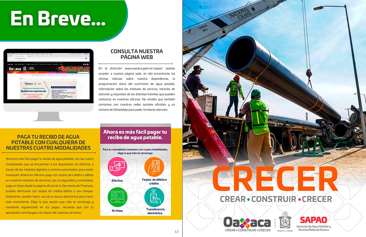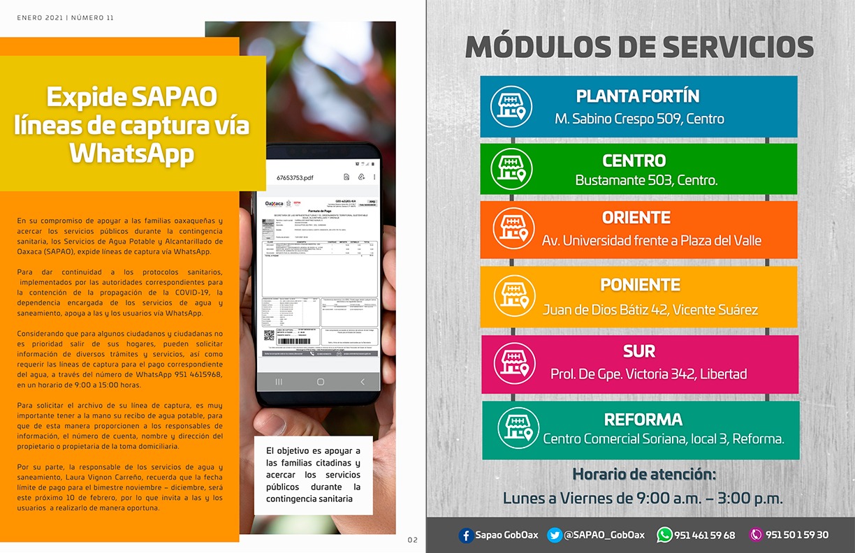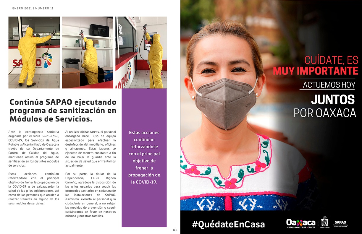 Oaxaca de Juárez, Oax. 04 de febrero del 2021. Los Servicios de Agua Potable y Alcantarillado de Oaxaca (SAPAO), han publicado para disposición del público cibernauta, la edición número 11 de su gaceta informativa, informó la directora general de esta dependencia.