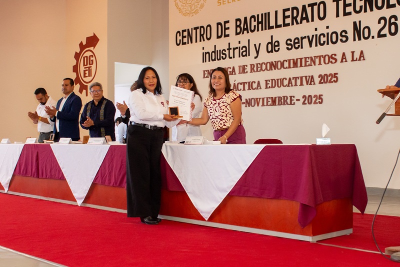 Oaxaca de Juárez, Oax., 19 de noviembre de 2025.- Por sus aportaciones al fortalecimiento de la educación media superior y sus estrategias pedagógicas creativas y originales, 10 docentes del Colegio de Bachilleres del Estado de Oaxaca (Cobao) recibieron de la Secretaría de Educación Pública del Gobierno de México (SEP) el Reconocimiento a la Práctica Educativa 2025.