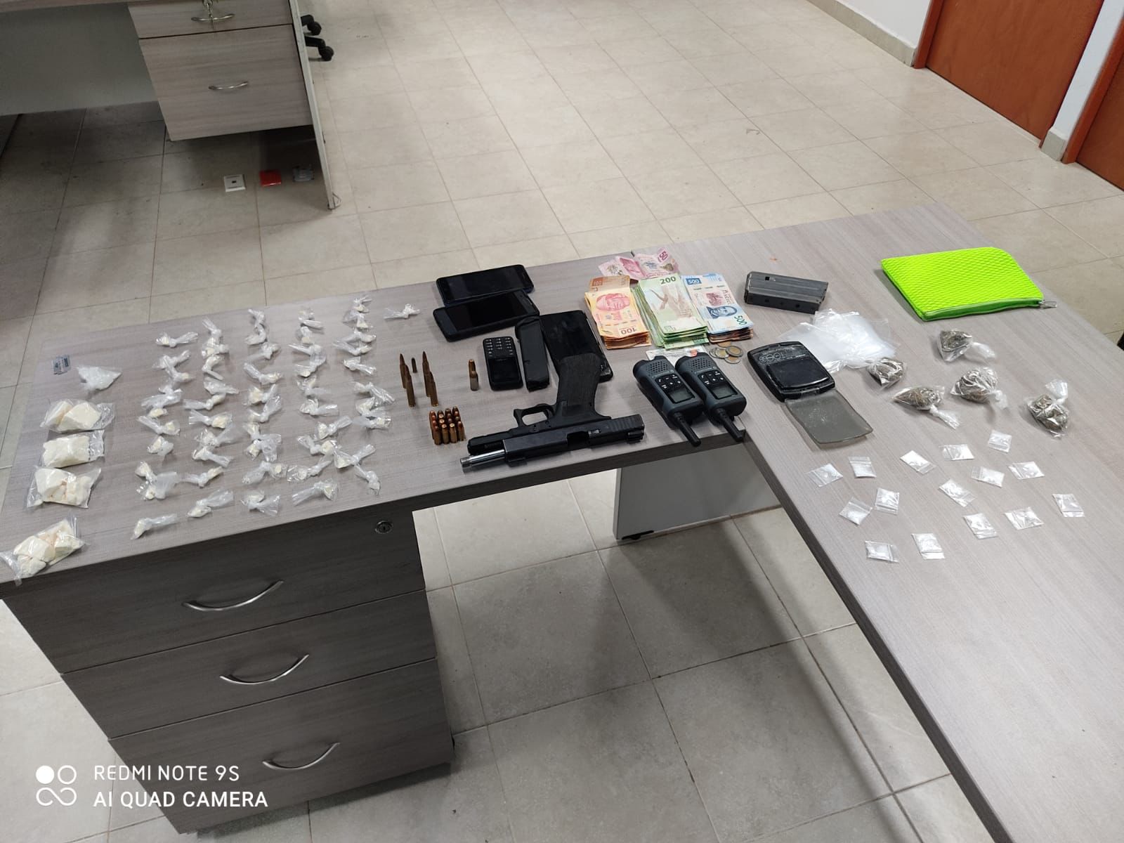 El primer cateo se realizó en un domicilio particular ubicado en inmediaciones de la colonia Guadalupe, en la Quinta Sección, donde elementos de la AEI aseguraron diversas dosis de las drogas denominadas cocaína y cristal, así como un arma de fuego, cargadores y cartuchos útiles de diversos calibres, una báscula gramera, dos radios de comunicación, teléfonos celulares y más de 23 mil pesos de dinero en efectivo, además de la detención de los masculinos V. G. J. y L. S. L.
