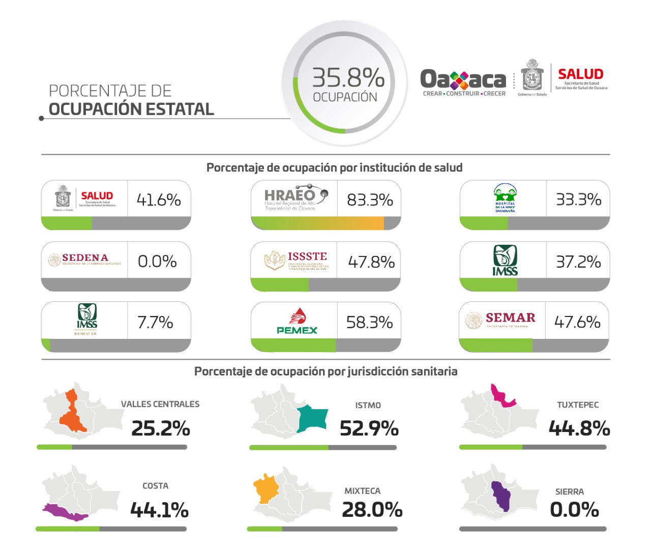 En relación a la red hospitalaria en Oaxaca, los SSO dijeron que se notificaron este 13 de julio, 11 nuevos ingresos hospitalarios a causa de la COVID-19, para un total de 129 personas internadas, lo que representa el 35.8% de ocupación médica; hay siete hospitales con el 100% de su capacidad.