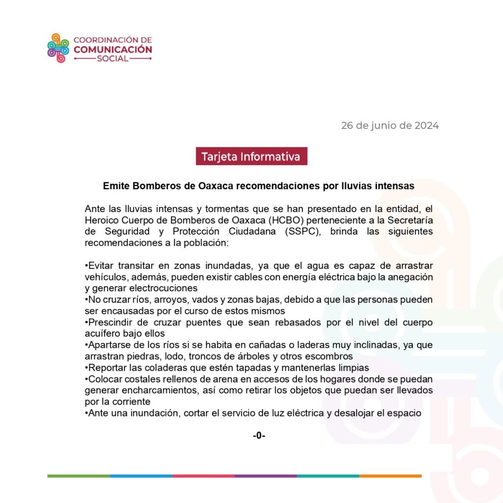 Ante las lluvias intensas y tormentas que se han presentado en la entidad, el Heroico Cuerpo de Bomberos de Oaxaca (HCBO) perteneciente a la Secretaría de Seguridad y Protección Ciudadana (SSPC), brinda las siguientes recomendaciones a la población:
