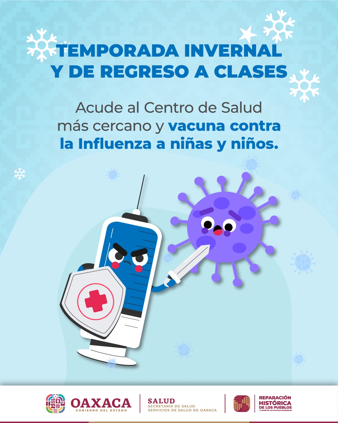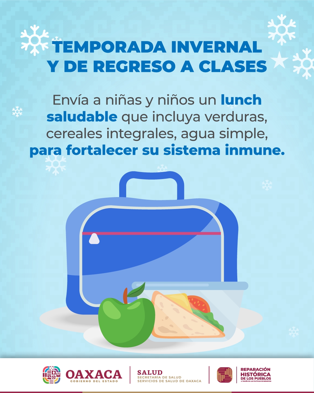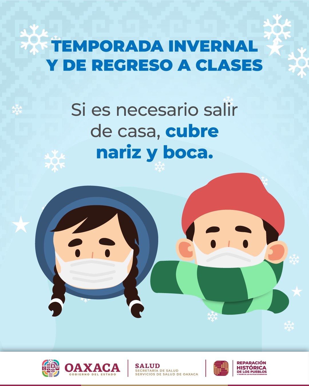 Oaxaca de Juárez, Oax. 8 de enero de 2023.- Para evitar el riesgo de contagio de COVID-19 en el entorno educativo, después de este periodo vacacional, los Servicios de Salud de Oaxaca (SSO), destacan la importancia de que las madres, padres de familia o tutores, aconsejen al alumnado sobre el cumplimiento de las medidas sanitarias vigentes, ante la sexta ola de la pandemia.