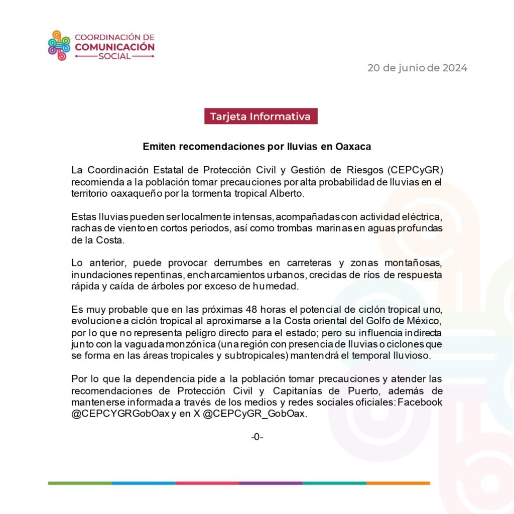 La Coordinación Estatal de Protección Civil y Gestión de Riesgos (CEPCyGR) recomienda a la población tomar precauciones por alta probabilidad de lluvias en el territorio oaxaqueño por la tormenta tropical Alberto.