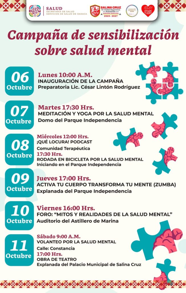 Salina Cruz, Oax., 5 de octubre de 2025.- Servicios de Salud de Oaxaca (SSO) en coordinación con el Ayuntamiento de Salina Cruz, emprenderá una Campaña Gratuita de Sensibilización por la Salud Mental, del 6 al 11 de octubre, con el objetivo de promover el bienestar emocional y la atención oportuna de los trastornos mentales en la región.