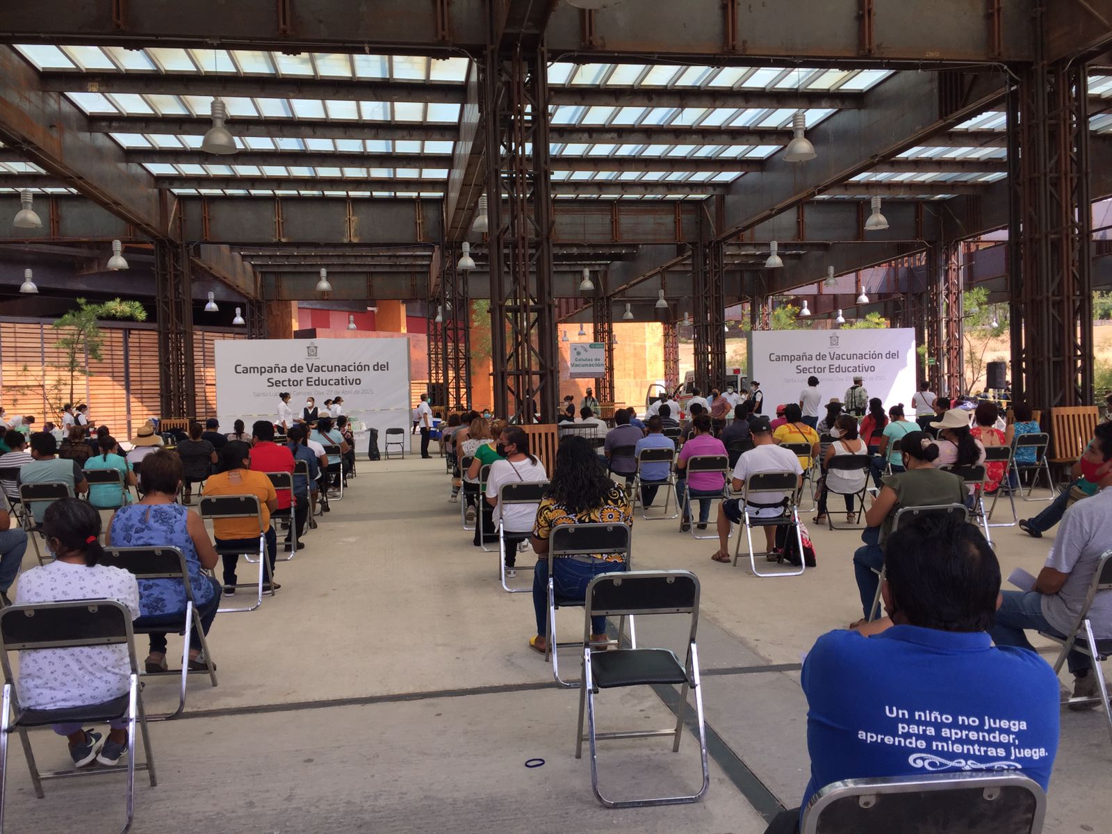 Oaxaca de Juárez, Oax. 28 de abril de 2021.- En un ambiente de calma, en orden y con tiempos reducidos de espera, se desarrolla este miércoles la jornada de vacunación contra la COVID-19 para el personal del sector educativo de la entidad, tanto público como privado, informaron los Servicios de Salud de Oaxaca (SSO).