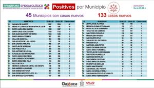 Enfatizó que son 45 municipios los que presentaron casos nuevos, para un total de 133 pacientes, principalmente en: Oaxaca de Juárez con 37, Heroica Ciudad de Huajuapan de León con 10, Santa Lucía del Camino con nueve, Santa Cruz Xoxocotlán con siete, y San Juan Bautista Tuxtepec con seis. Asimismo, por primera vez Santa María Temaxcalapa notificó un contagio.