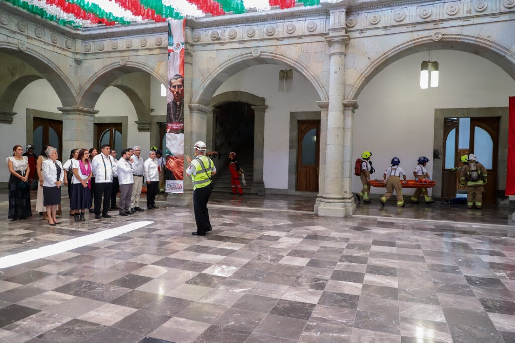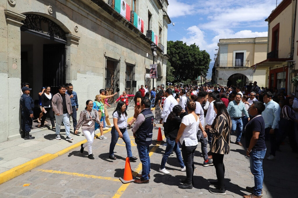 Como parte de este ejercicio que tuvo como escenario una hipótesis de sismo magnitud 8.0 con epicentro en Acapulco, Guerrero, trabajadoras y trabajadores de Gobierno, así como visitantes y personas que ingresaron a realizar algún trámite a la sede del Poder Ejecutivo, procedieron a desalojar el inmueble una vez que las alertas sísmicas se activaron en punto de las 11:00 horas.