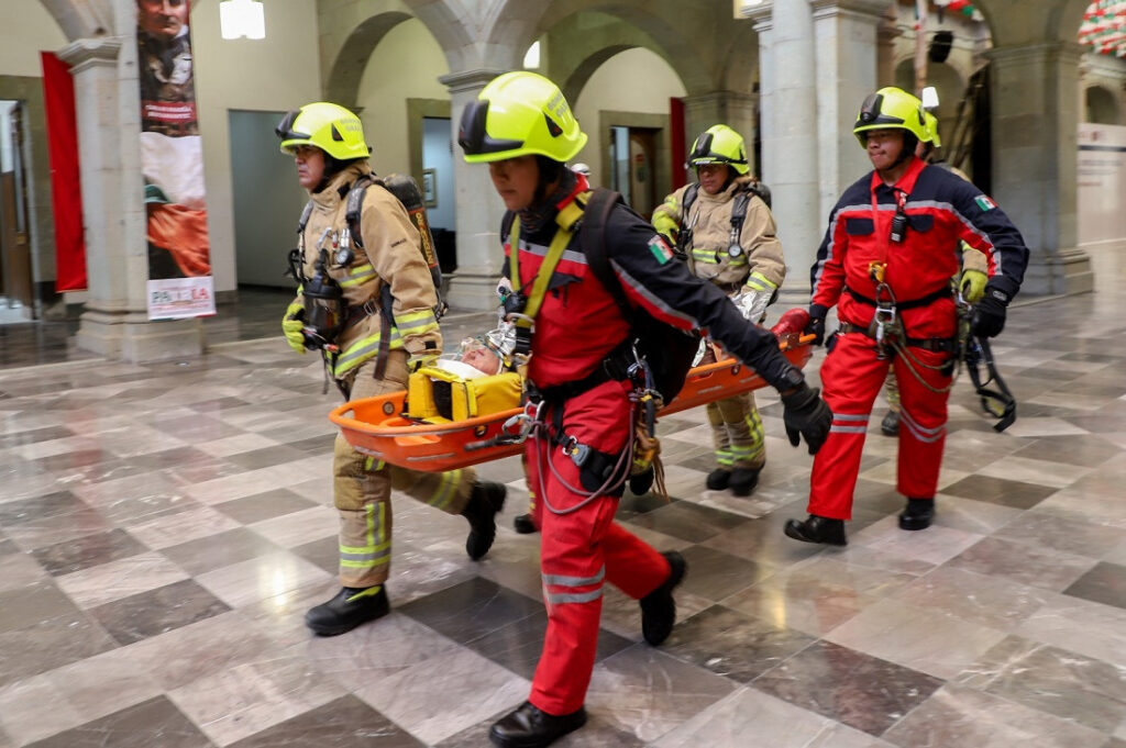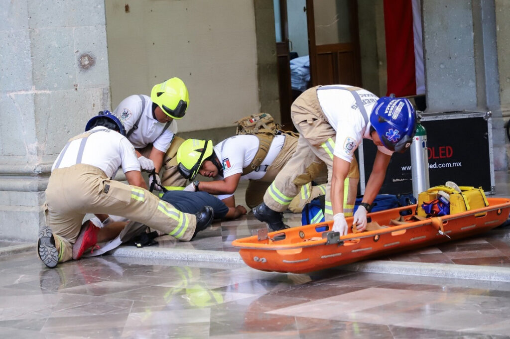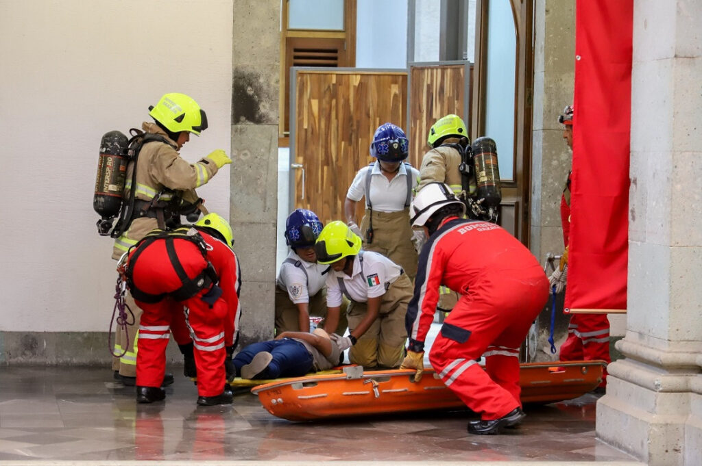 En este simulacro en Palacio de Gobierno participaron 25 elementos entre paramédicos, rescatistas y personal contra incendios, así como un autobomba, camión de rescate y dos ambulancias.