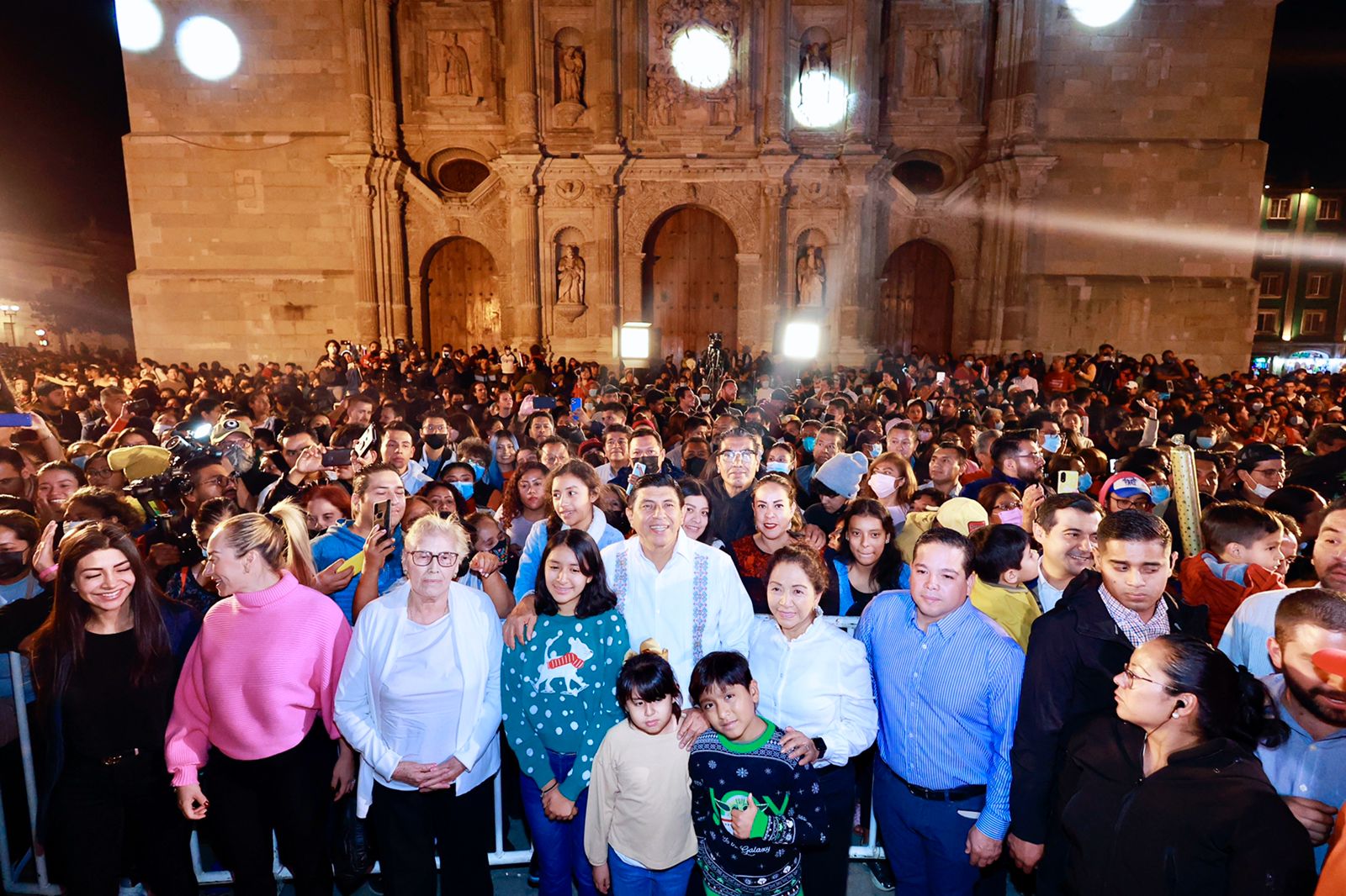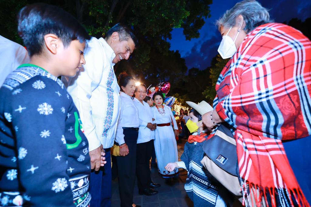 Oaxaca de Juárez, Oax. 11 de diciembre de 2022.- En un ambiente lleno de alegría, hermandad y emoción, el Gobernador del Estado de Oaxaca, Salomón Jara Cruz, acompañado de su esposa, la presidenta honoraria del Sistema para el Desarrollo Integral de la Familia (DIF) Estatal, Irma Bolaños Quijano y su familia, realizaron el encendido del “Árbol de la Regeneración de la Esperanza”, con el que se dio inicio a la celebración de las fiestas de Fin de Año.