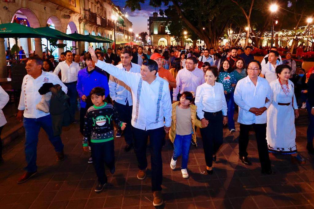 Acompañado del presidente municipal de Oaxaca de Juárez, Francisco Martínez Neri, el Jefe del Poder Ejecutivo Estatal expresó que; “encender el árbol monumental es símbolo de alegría, es el árbol de la regeneración de la esperanza, queremos representar el espíritu comunitario y solidario que define la esencia de nuestras comunidades, el pueblo que ha decidido transformar su historia.