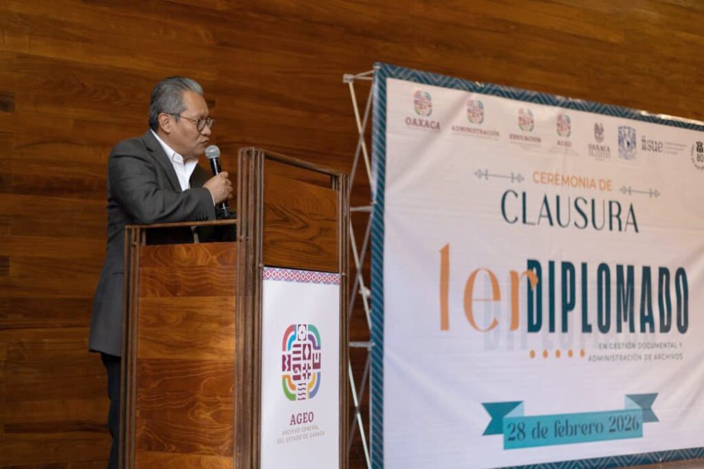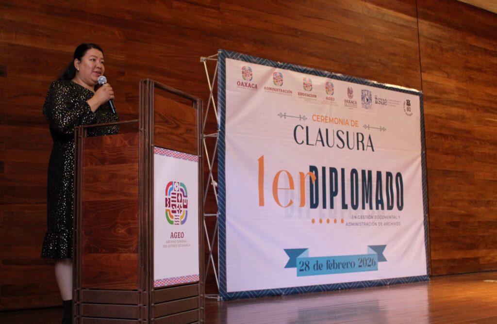Oaxaca de Juárez, Oax., 28 de febrero de 2026.- El Archivo General del Estado de Oaxaca (AGEO) entregó certificados a quienes concluyeron el primer Diplomado en Gestión Documental y Administración de Archivos, cuyo objetivo es fortalecer la preservación del patrimonio documental y fomentar prácticas más eficientes en el manejo de la información pública.