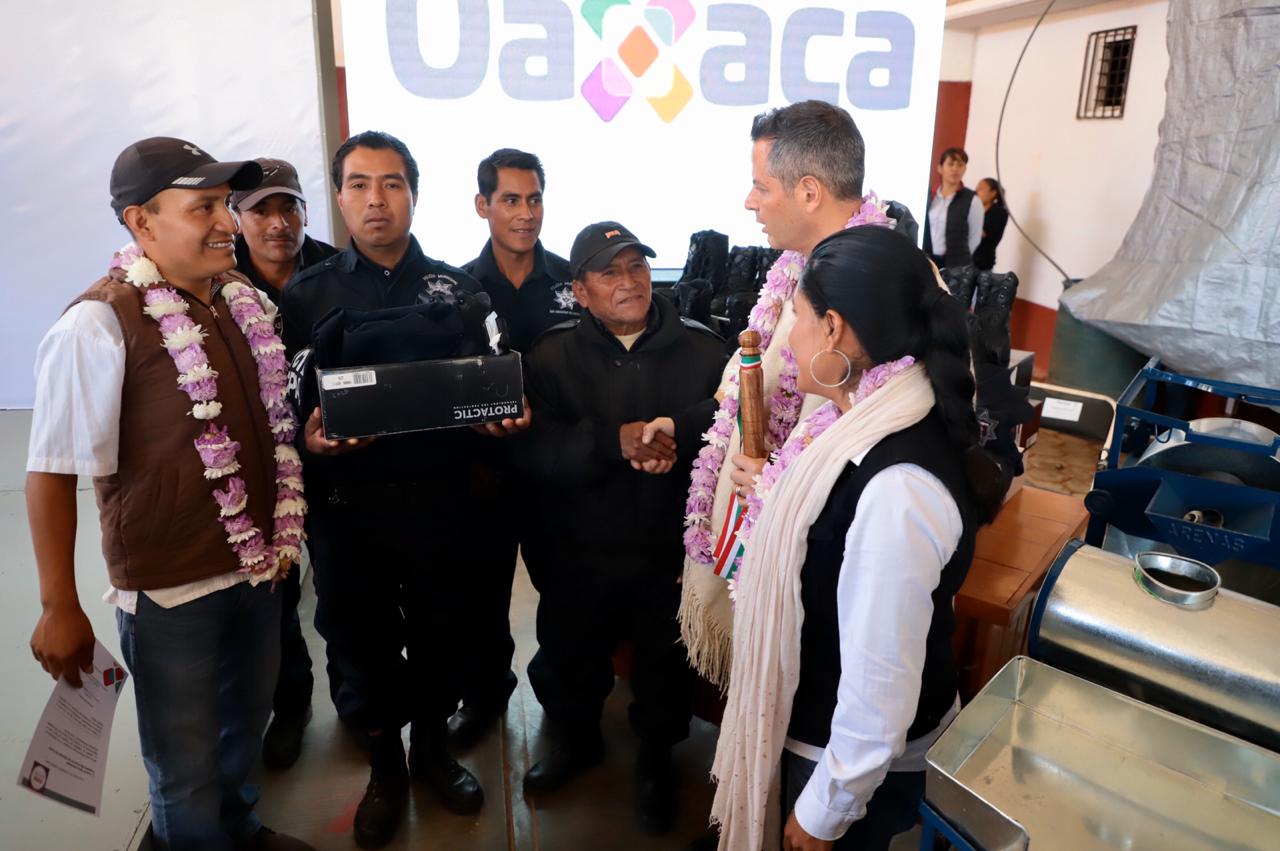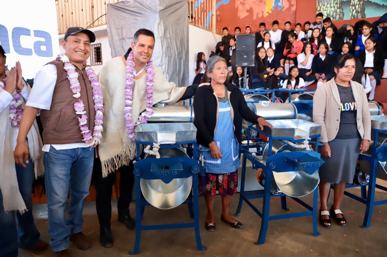 Murat Hinojosa también hizo entrega junto a la titular de la Secretaría de los Pueblos Indígenas y Afromexicano (Sepia), Eufrosina Cruz Mendoza, de 10 molinos de nixtamal, un paquete de material de construcción al municipio, así como de dos paquetes tecnológicos -que contienen proyectores, computadoras, mesas y propuestas pedagógicas- además de tres cubetas de pintura; todo ello mediante una inversión de 132 mil 500 pesos.