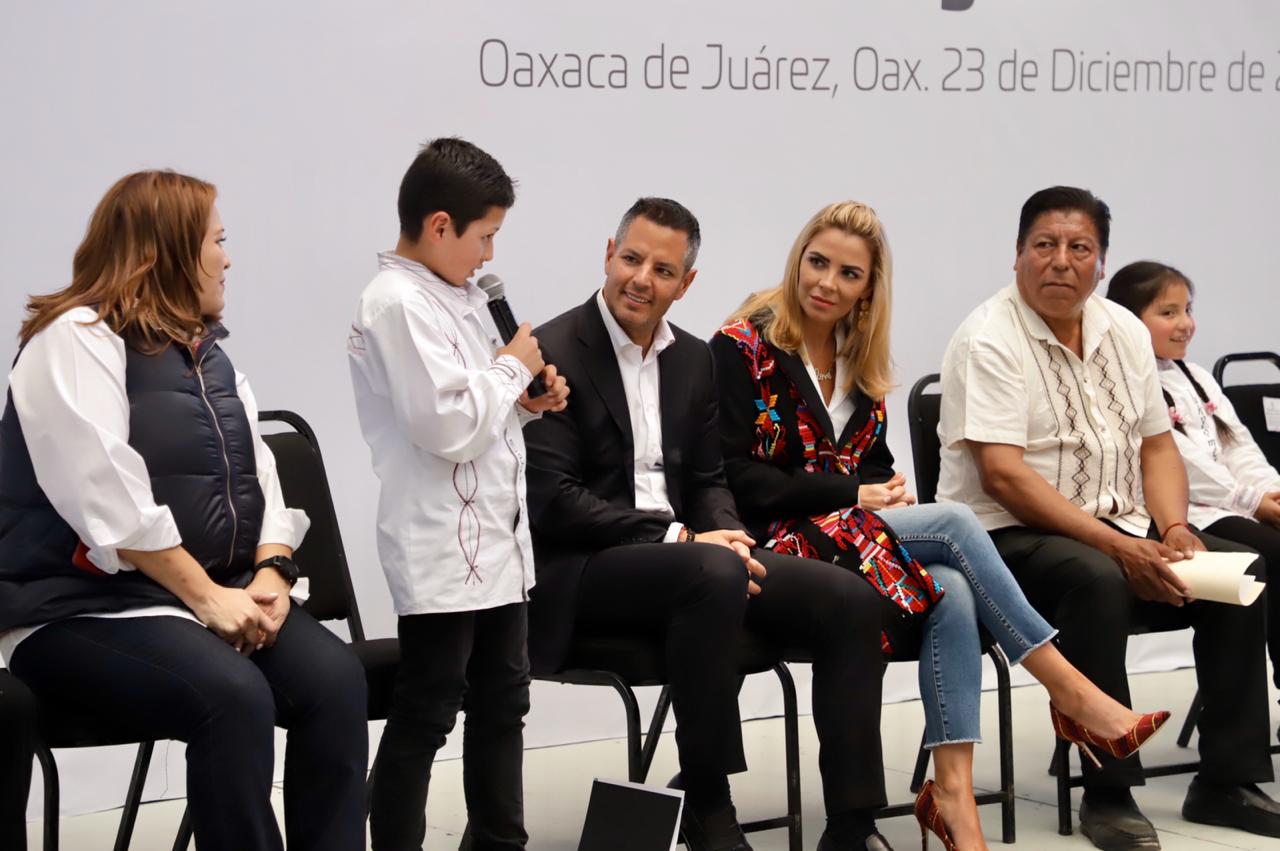 La entrega de estos apoyos fue encabezada por el gobernador Alejandro Murat Hinojosa, quien estuvo acompañado de la presidenta honoraria del Sistema Estatal para el Desarrollo Integral de la Familia (DIF) Oaxaca, Ivette Morán de Murat, atendiendo de manera inmediata la necesidad de dotar a las y los integrantes de esta agrupación de su principal herramienta de aprendizaje y vocación.