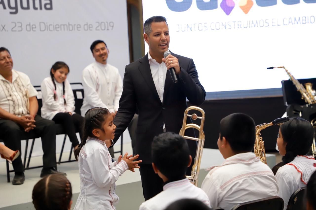 Oaxaca de Juárez, Oax. 23 de diciembre de 2019. Nuevamente la sonrisa en los rostros de las y los niños, así como jóvenes que integran la Banda Filarmónica Municipal de San Pedro y San Pablo Ayutla, Mixe se hizo presente, al recibir una dotación de 35 instrumentos musicales, en restitución de los que les fueron hurtados el pasado 14 de diciembre.