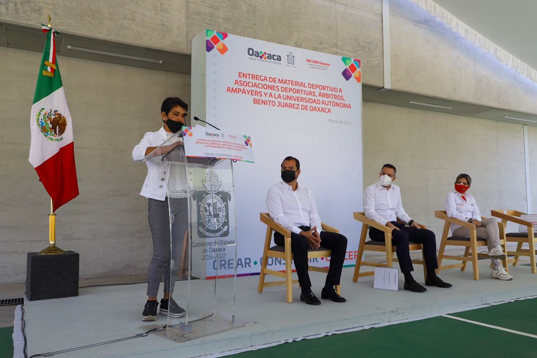 Oaxaca de Juárez, Oax. 2 de marzo de 2021. Con una inversión total de 459 mil 887 pesos, el gobernador Alejandro Murat Hinojosa, en compañía de la directora del Instituto de Cultura Física y Deporte de Oaxaca (Incude Oaxaca), Montserrat de los Ángeles Aragón Heinze, entregó material deportivo a 10 organismos deportivos y 830 deportistas, como parte de su compromiso de seguir impulsando la actividad física de las personas en el estado.