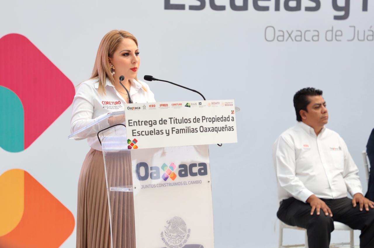 Así también la directora de la Comisión para la Regularización de la Tenencia de la Tierra Urbana del Estado de Oaxaca (Coreturo), Karen Lazo Ramos, expuso que estas acciones son resultado de la firma del Convenio de Colaboración para la Certeza Jurídica en la Tenencia de la Tierra y Propiedad de los Núcleos Agrarios que establecieron los gobiernos Federal y Estatal para otorgar títulos de propiedad de manera gratuita.