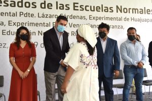 “Ustedes se encuentran en el umbral de una profesión que ejercida con compromiso social y amor al prójimo, contribuye significativamente al bienestar y al mejoramiento de las condiciones de vida de las comunidades”, enfatizó en la ceremonia en la que estuvo acompañado del subdirector General de Servicios Educativos, Álvaro César Guevara Ramírez; del titular de la Unidad de Educación Normal y Formación de Docentes, Carlos Alberto Cuevas Cervantes, directores y subdirectores de Escuelas Normales.