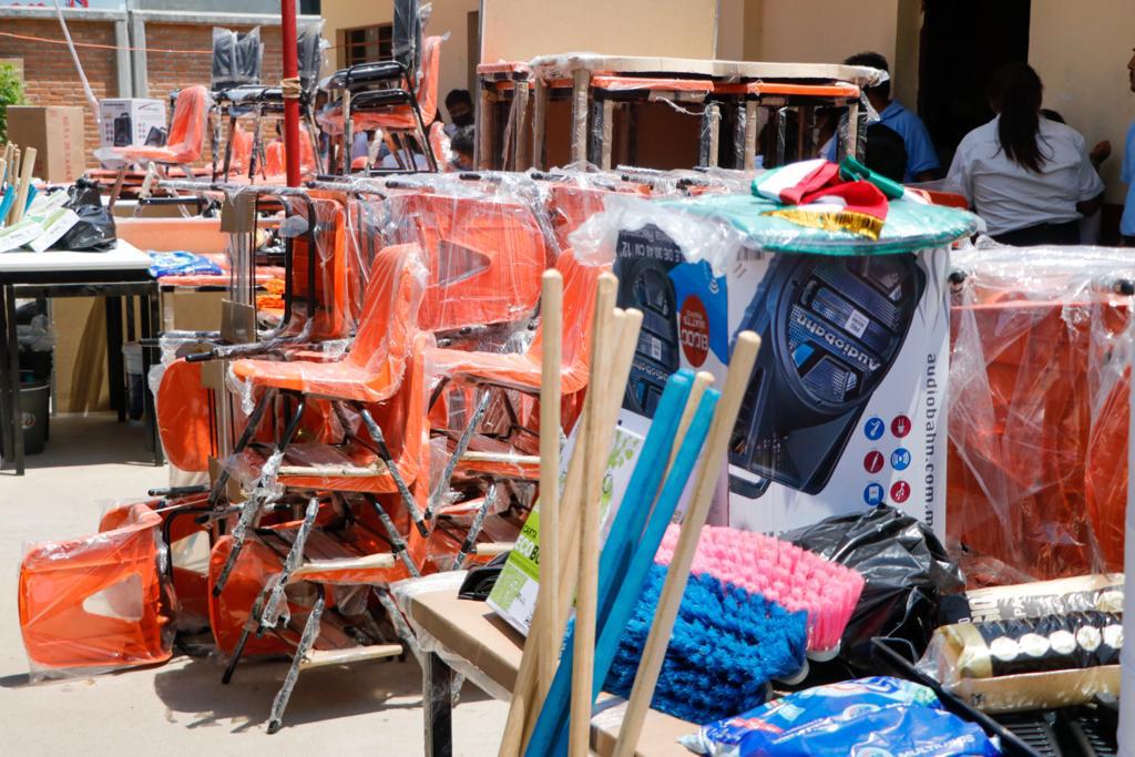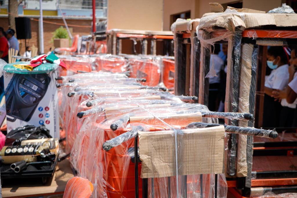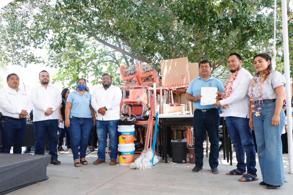 Juchitán de Zaragoza, Oax. 31 de marzo de 2023.- En el compromiso del Gobernador del Estado Salomón Jara Cruz, de mejorar las condiciones de los planteles de educación básica y cumplir con el eje transversal de su administración sobre el Interés Superior de Niñas, Niños y Adolescentes, el director general del Instituto Estatal de Educación Pública de Oaxaca (IEEPO), Emilio Montero Pérez entregó en Juchitán de Zaragoza, mobiliario, material de aseo, deportivo, de oficina y pintura a nueve escuelas de esta zona.