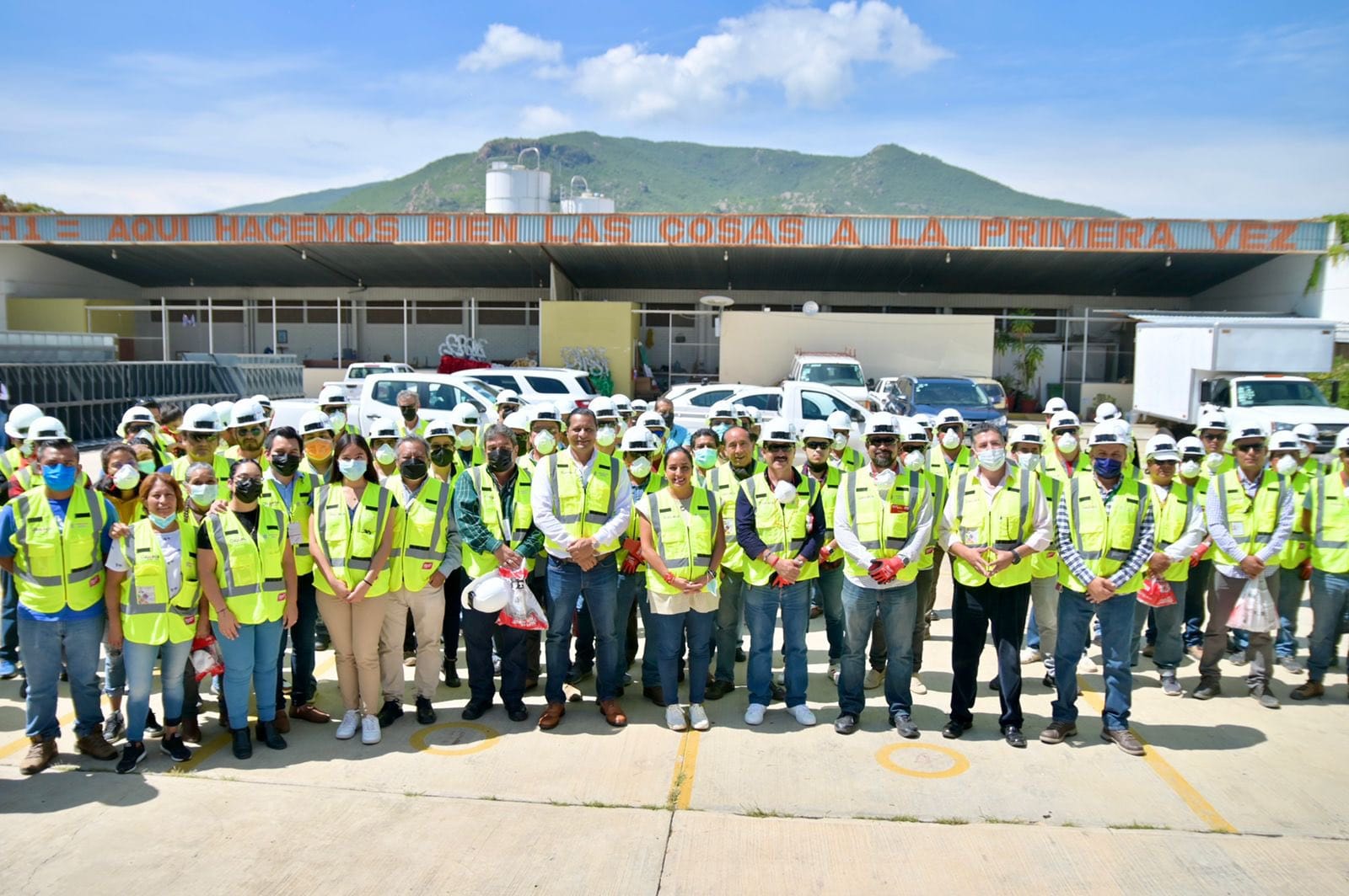 Con la presencia del responsable del área, Ángel Cervantes Madrid, Mariana Nassar hizo entrega de cascos, protectores para oídos, gafas, guantes y chalecos a decenas de trabajadoras y trabajadores, quienes brindan atención preventiva y correctiva a las instalaciones y equipos de Ciudad Administrativa, Ciudad Judicial, Palacio de Gobierno, entre otros espacios gubernamentales.