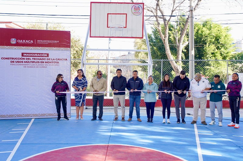 Oaxaca de Juárez, Oax. 8 de febrero de 2026. El Gobernador Salomón Jara Cruz inauguró la construcción del techado de la cancha de usos múltiples del fraccionamiento Álamos IVO en la agencia Montoya del municipio capitalino, que permitirá a las familias contar con un espacio de sana convivencia, fomento al deporte y la prevención de conductas de riesgo, especialmente entre la niñez y las juventudes.