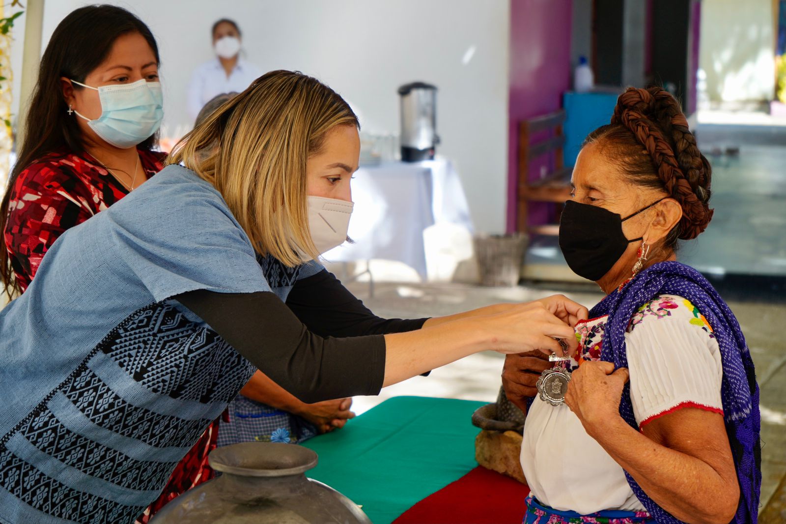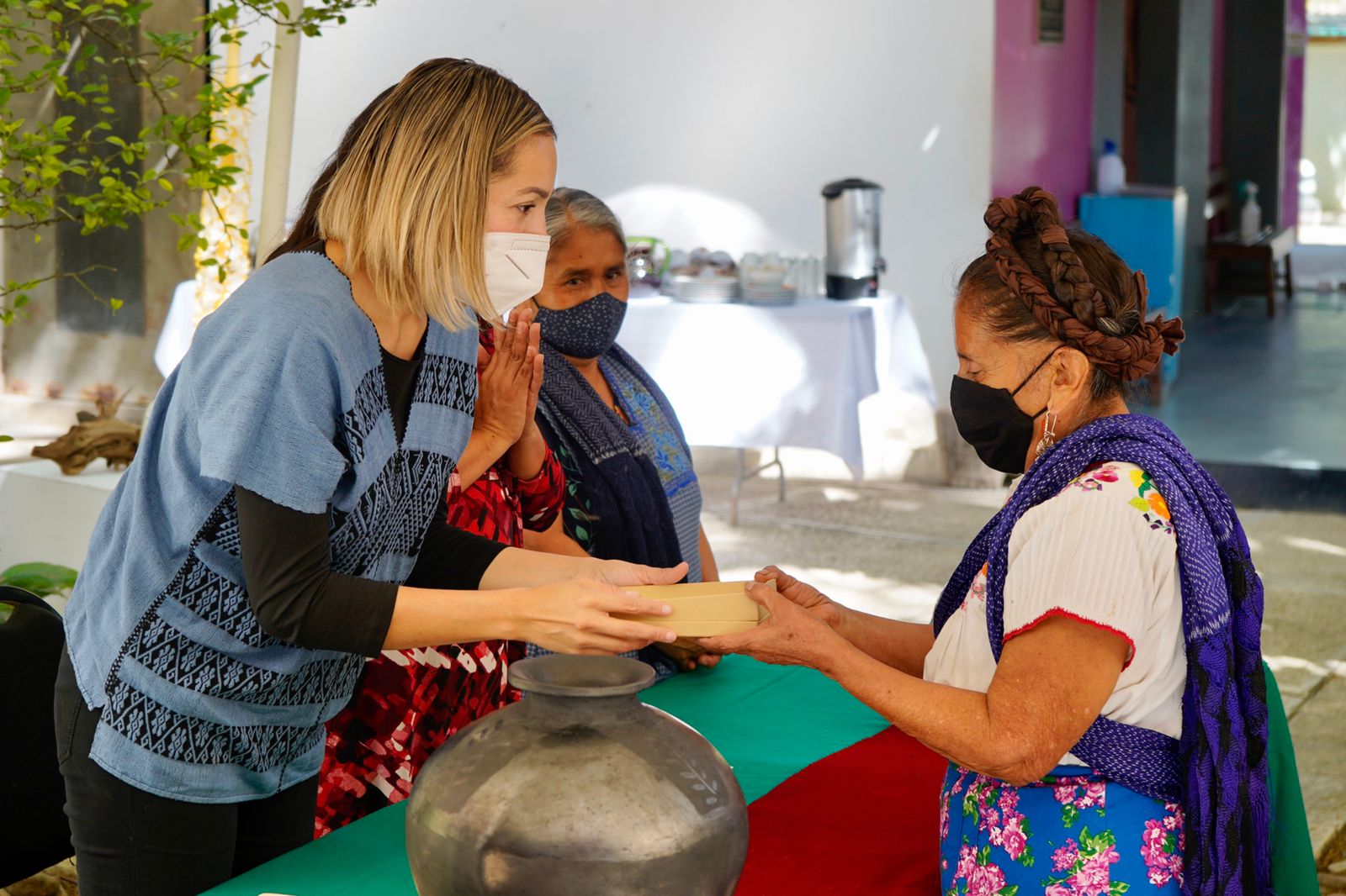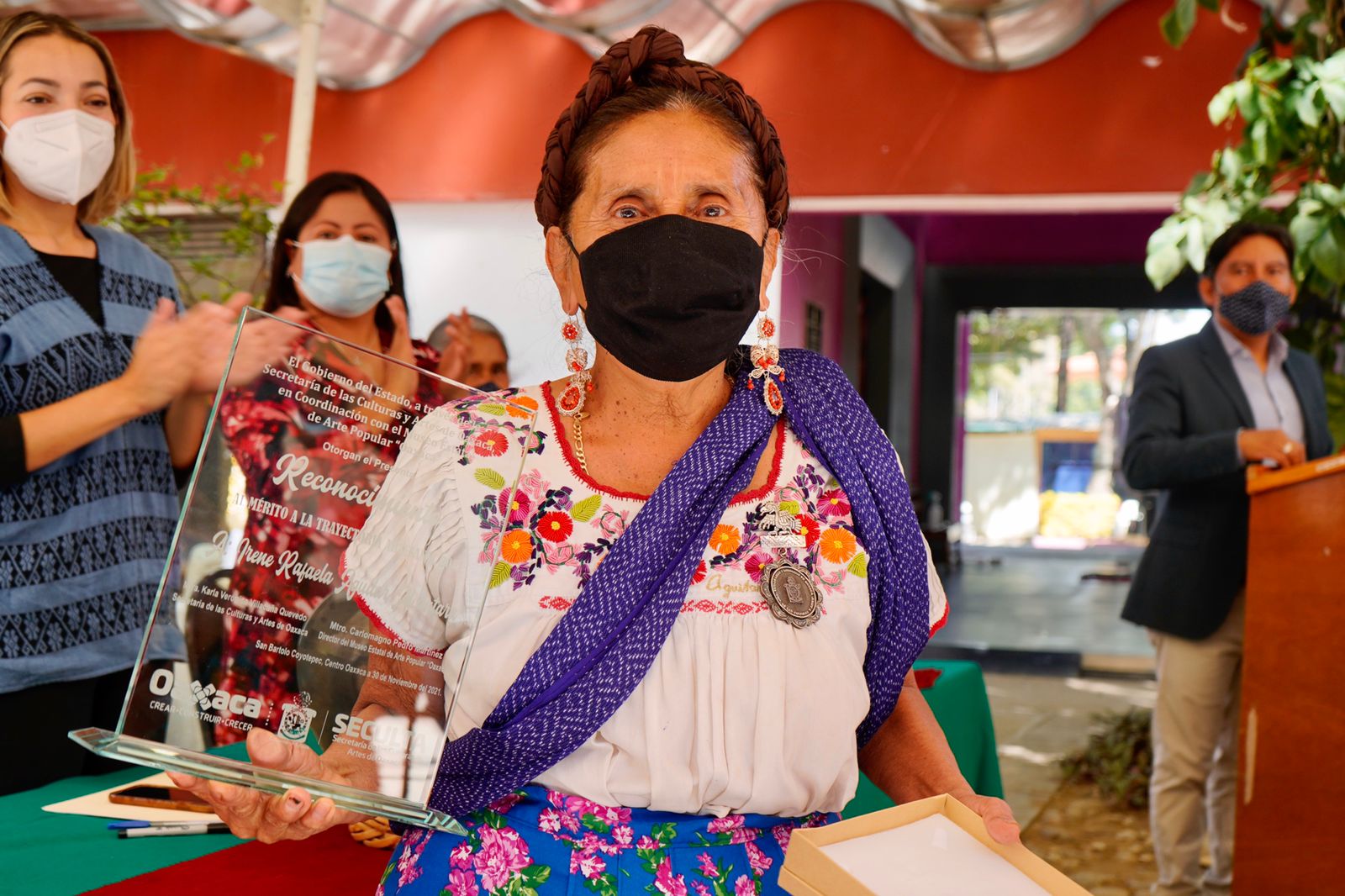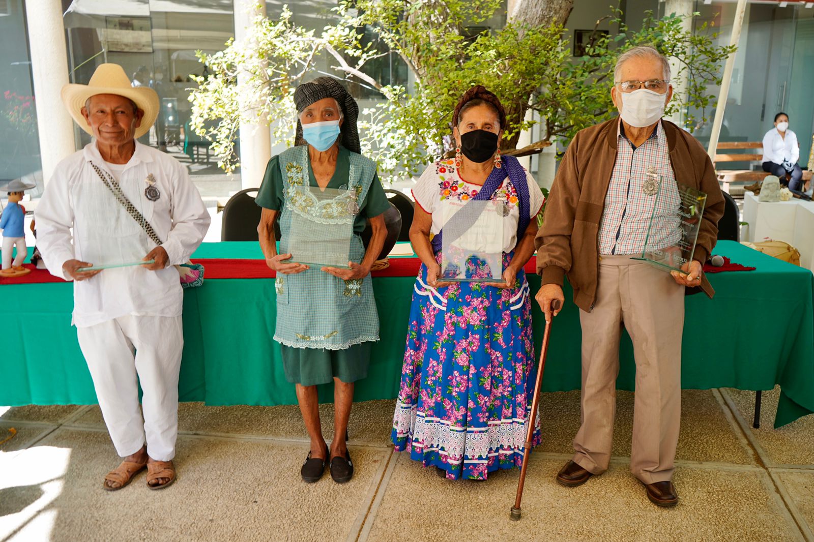 San Bartolo Coyotepec, Oax., 01 de diciembre de 2021.- Con el objetivo de reconocer la trayectoria, contribución y compromiso de artesanas y artesanos con trayectoria mayor a 40 años en la elaboración y producción de arte popular en sus diversas manifestaciones, la Secretaría de las Culturas y Artes de Oaxaca (Seculta) entregó cuatro medallas e igual número de reconocimientos a creadoras y creadores oaxaqueños.