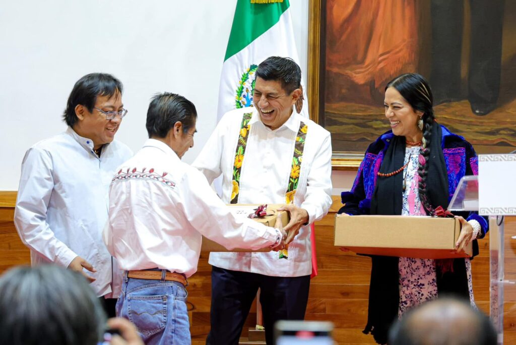 En este encuentro con los medios, el Gobernador Salomón Jara, la cantante Lila Dows y el titular de la Seculta, Víctor Cata, entregaron los paquetes a representantes de Santa María del Mar, San Simón Zahuatlán, San Juan Bautista Lo de Soto, San Melchor Betaza y San Miguel El Grande.