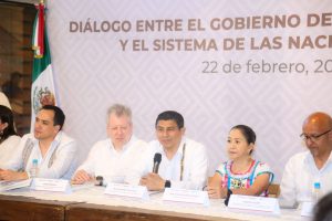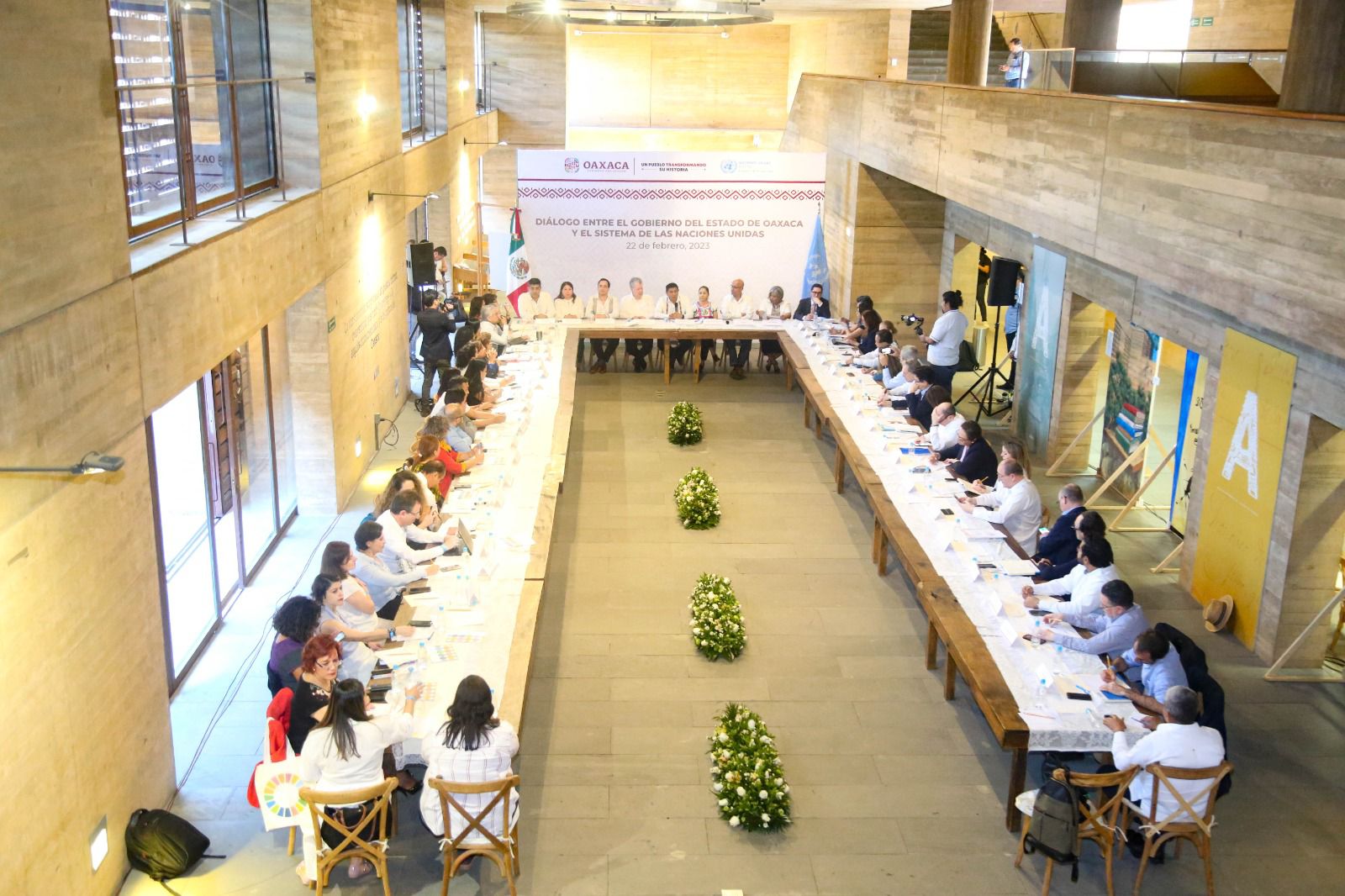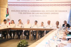 En la reunión realizada en las instalaciones del Archivo General del Estado de Oaxaca, con representantes del Sistema de Naciones Unidas en México (ONU México), el Mandatario reconoció la voluntad del Sistema para caminar de la mano con Oaxaca y explorar áreas de oportunidad para establecer marcos y acciones de colaboración que permitan avanzar en el cumplimiento de los objetivos de Desarrollo Sostenible, así como de la Agenda 20-30.