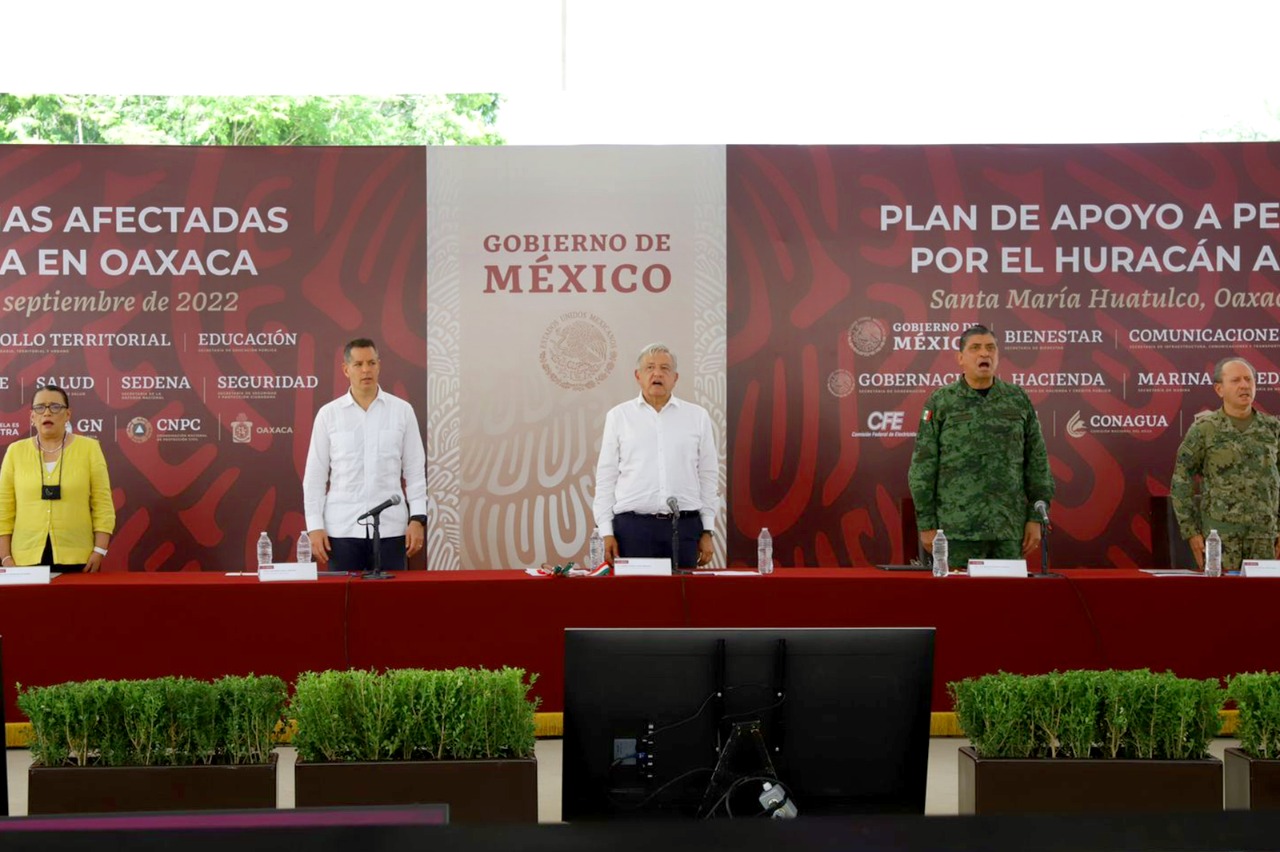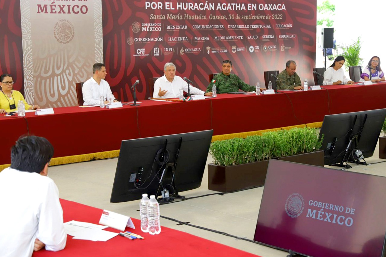 Santa María Huatulco, Oax. 30 de septiembre de 2022.- Como parte de su gira de trabajo por la entidad, el presidente de México, Andrés Manuel López Obrador, sostuvo una reunión con el gobernador Alejandro Murat Hinojosa, presidentes municipales, funcionarios estatales y federales, para evaluar los avances del Plan de Apoyo a la Población Afectada por el Huracán “Agatha” del pasado 30 de mayo.