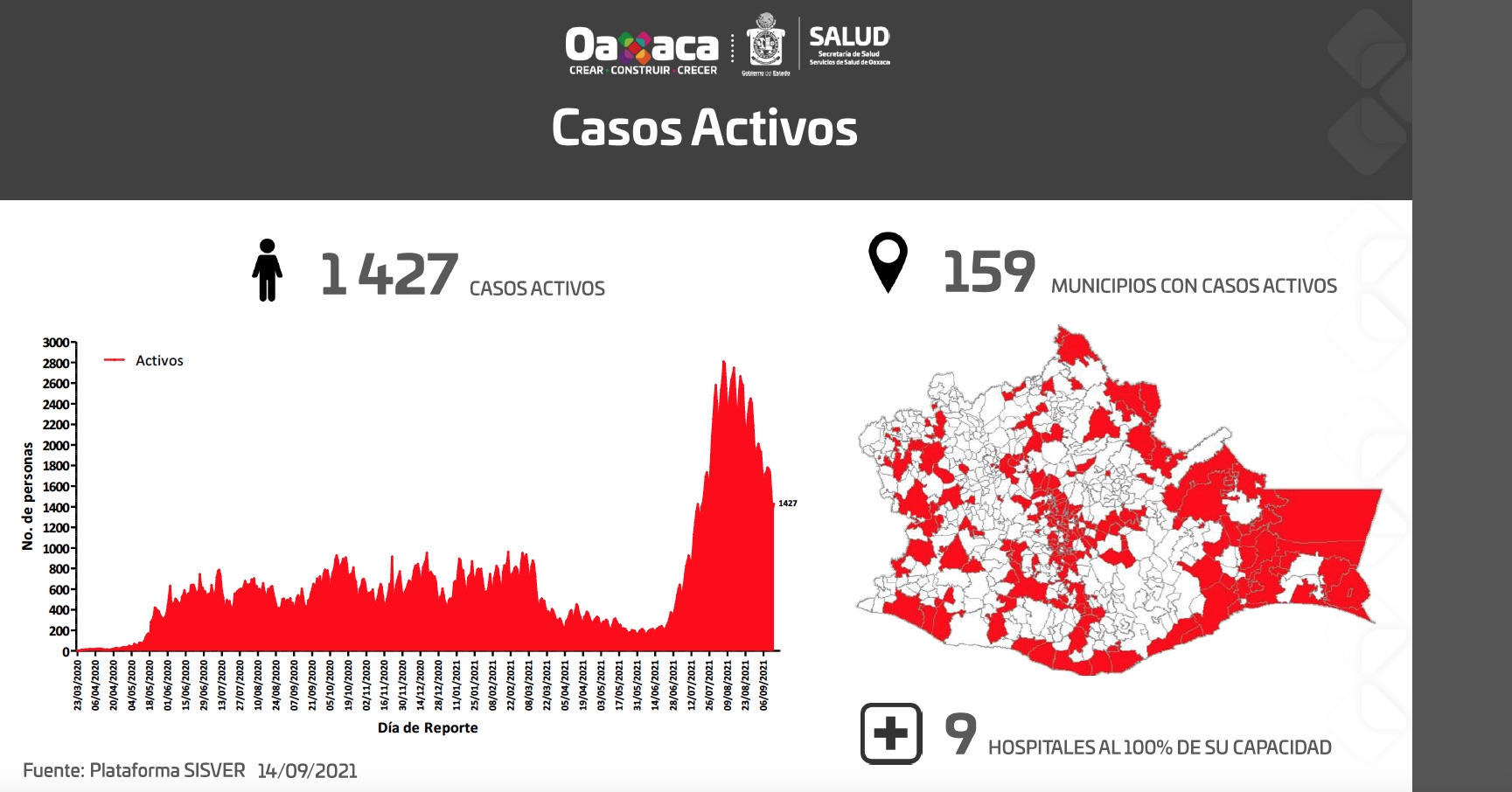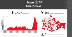 • Hay mil 427 casos activos en 159 municipios y 9 hospitales al 100% de su capacidad