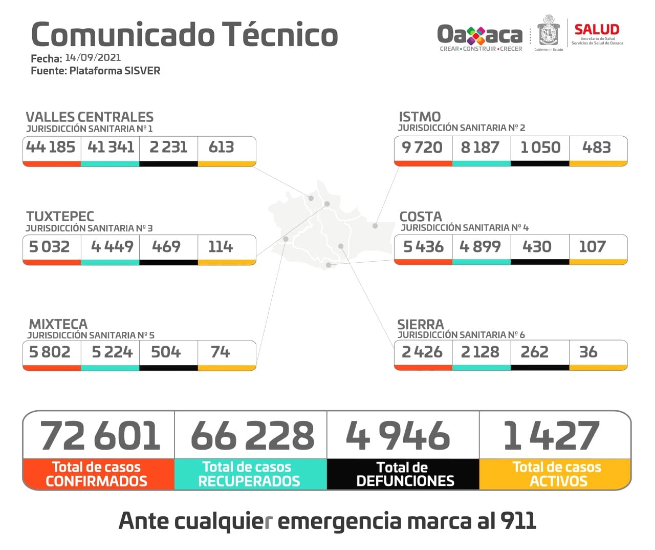 La Jurisdicción Sanitaria de Valles Centrales, lleva un registro de 44 mil 185 casos confirmados y dos mil 231 defunciones; Istmo nueve mil 720 casos confirmados y mil 50 defunciones; Tuxtepec cinco mil 32 casos confirmados y 469 defunciones; Costa cinco mil 436 casos confirmados y 430 defunciones; Mixteca cinco mil 802 casos confirmados y 504 defunciones; Sierra dos mil 426 casos confirmados y 262 defunciones.