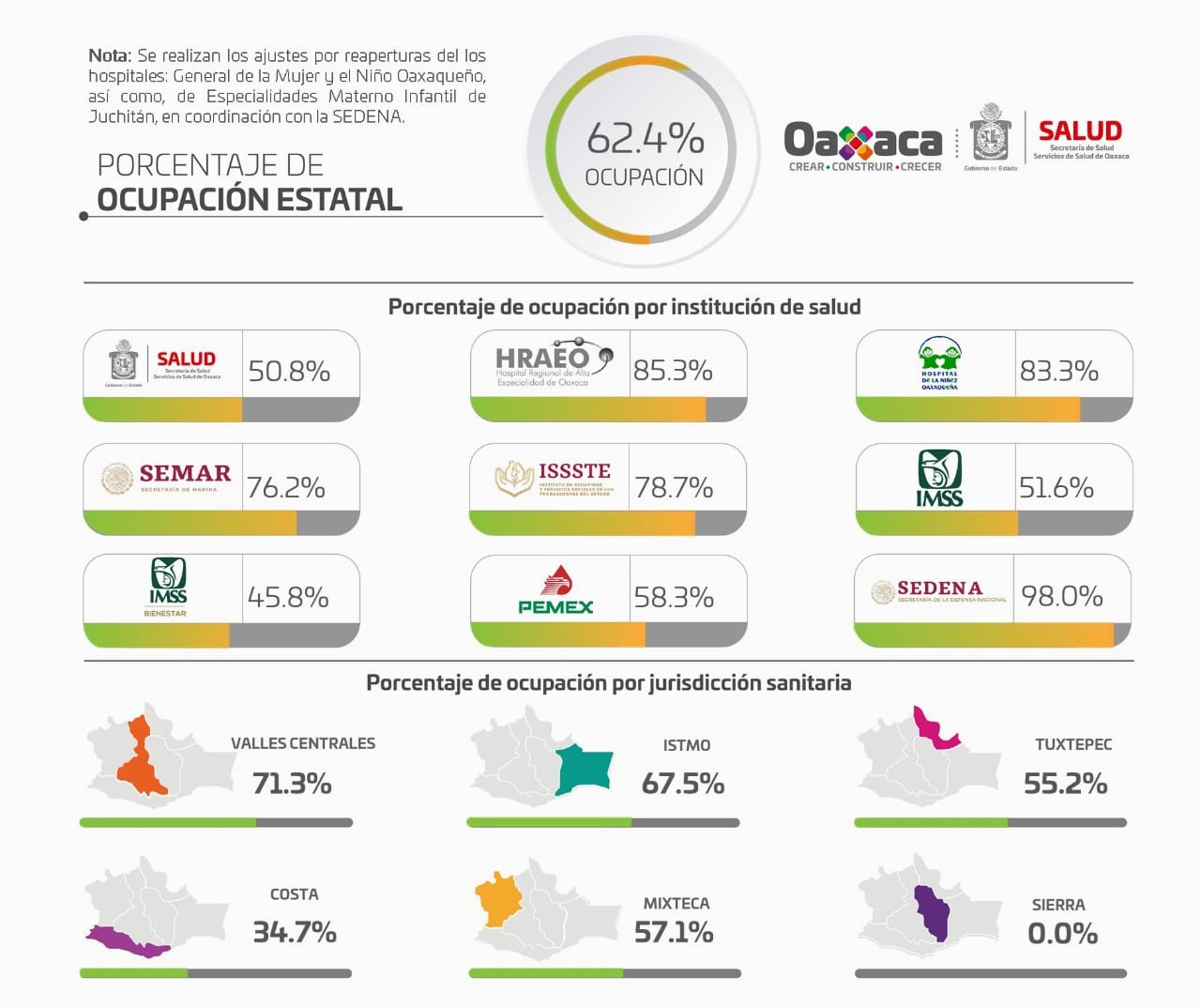 En relación a la ocupación hospitalaria, destaca la Jurisdicción Sanitaria de Valles Centrales con 71.3%, seguida del Istmo con 67.5%, Mixteca con 57.1%, Tuxtepec con el 55.2%, Costa 34.7% y Sierra 0%; de las 508 camas destinadas para pacientes con esta enfermedad, se encuentran disponibles 193.