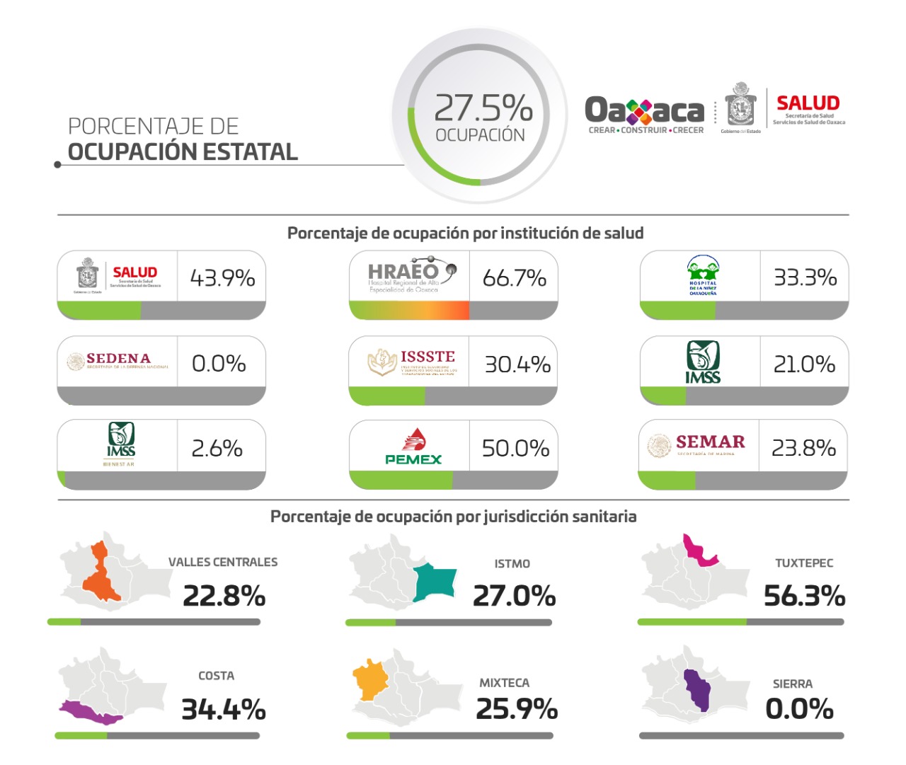 La Jurisdicción Sanitaria número uno Valles Centrales, contabiliza 32 mil 793 casos confirmados y mil 918 defunciones, Istmo cuatro mil 821 y 761 defunciones, Tuxtepec tres mil 23 casos confirmados y 356 defunciones, Costa dos mil 641 confirmados y 314 defunciones, Mixteca cuatro mil 97 confirmados y 408 defunciones, Sierra mil 761 confirmados y 224 defunciones.
