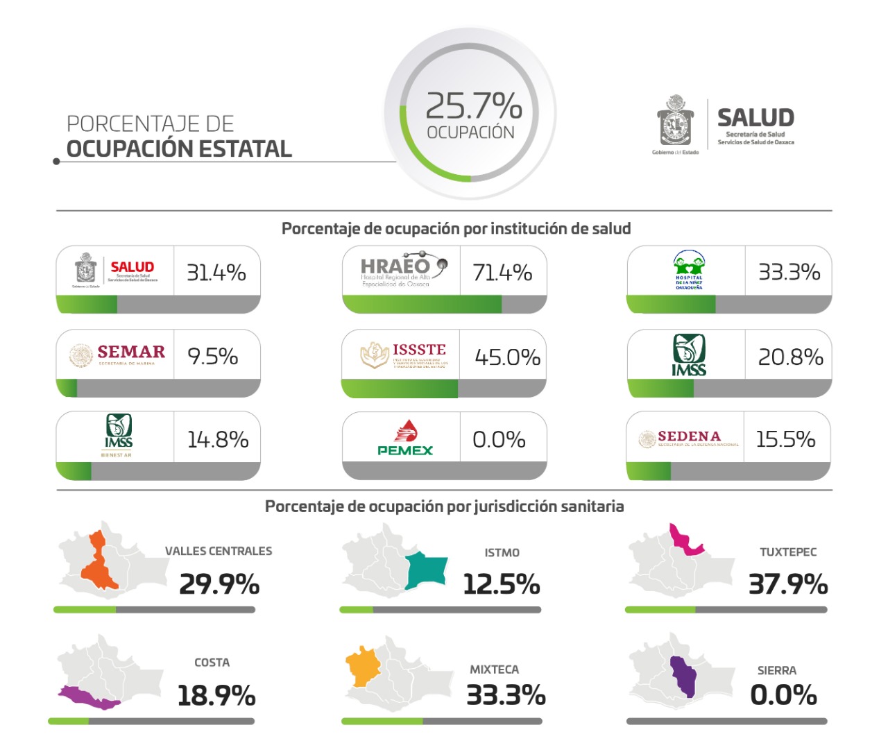 Dijo que en ocupación hospitalaria a la fecha se tiene una tasa total de 604 camas, de las cuales hay disponibles 449 y 155 ocupadas. La Jurisdicción Sanitaria de Valles centrales tiene una tasa del 29.9%, Tuxtepec 37.9%, Mixteca 33.3%, Istmo 12.5%, Costa 18.9 y la Sierra 0 %.