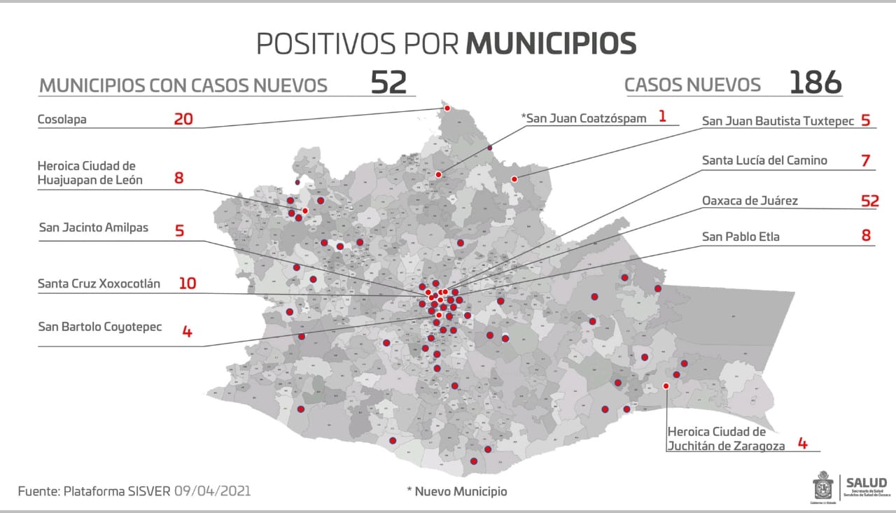 Señaló que los 186 casos nuevos se ubican en 52 municipios, siendo los que mayor número de casos presentan: Oaxaca de Juárez con 52, Cosolapa 20, Santa Cruz Xoxocotlán 10, Huajuapan de León y San Pablo Etla ocho cada uno, Santa Lucía del Camino siete,  San Jacinto Amilpas y San Juan Bautista Tuxtepec cinco cada uno; el resto cuatro, tres, dos y un caso.