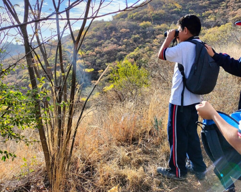 Durante la jornada que tuvo como sede el ANP del Parque Estatal Cerro del Fortín, se realizó un recorrido naturalista con cerca de 270 niñas y niños, quienes, en compañía de sus profesoras y profesores, así como del equipo de la Secretaría, observaron mediante binoculares las especies de aves que habitan el lugar.