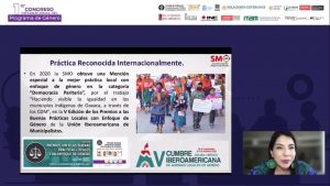 Finalmente, Vásquez Colmenares informó que en 2020 la SMO obtuvo una mención especial a la mejor práctica local con enfoque de género en la categoría “Democracia Paritaria”, por el trabajo “Haciendo visible la igualdad en los municipios indígenas de Oaxaca, a través de los CDM”, en la V Edición de los Premios a las Buenas Prácticas Locales con Enfoque de Género de la Unión Iberoamericana de Municipalistas.