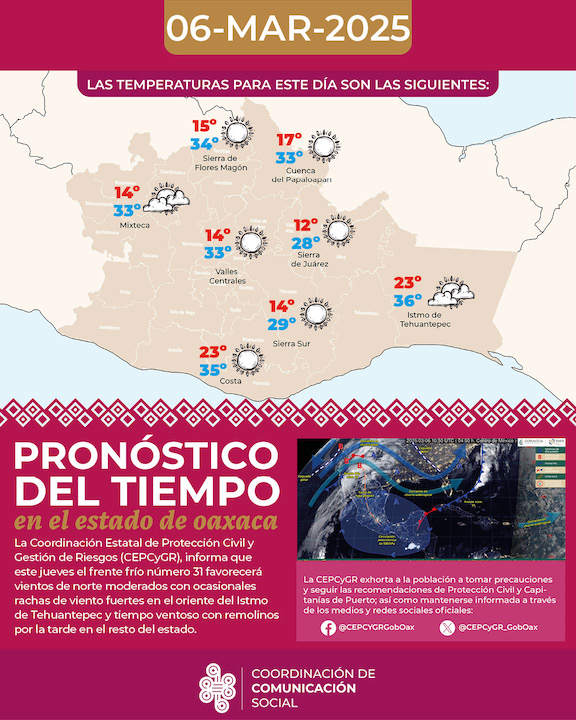 Oaxaca de Juárez, Oax. 6 de marzo de 2025.- La Coordinación Estatal de Protección Civil y Gestión de Riesgos (CEPCyGR), informa que este jueves el frente frío número 31 favorecerá vientos de norte moderados con ocasionales rachas de viento fuertes en el oriente del Istmo de Tehuantepec y tiempo ventoso con remolinos por la tarde en el resto del estado.