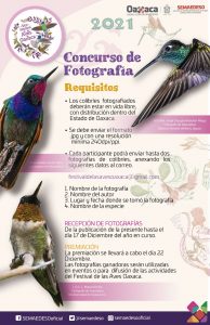 Oaxaca de Juárez, Oax; 13 de diciembre de 2021.- Como parte de las actividades del 5º Festival virtual de las Aves Oaxaca 2021, el Comité Organizador del evento en coordinación con el Gobierno del Estado de Oaxaca a través de la Secretaría del Medio Ambiente, Energías y Desarrollo Sustentable (Semaedeso) invita al concurso de fotografía “Colibries, belleza iridiscente”.