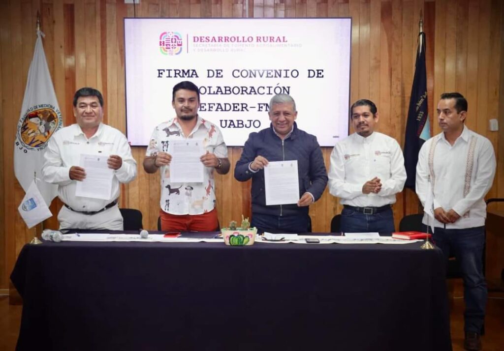 La signatura de este convenio se realizó con la presencia del titular de la Sefader, Víctor López Leyva y el director de la Facultad de Medicina Veterinaria de la UABJO, Eleazar Altamirano Mijangos.
