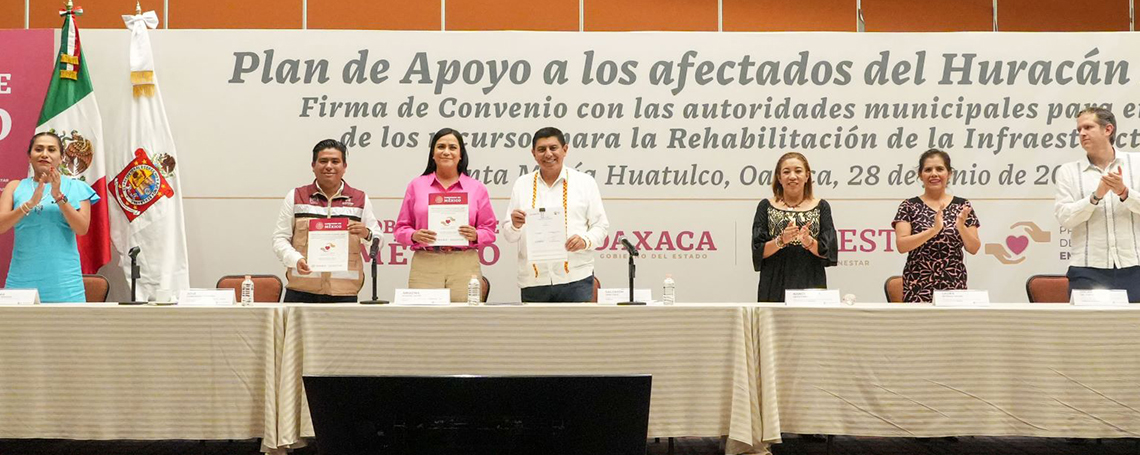 Durante la firma realizada en el municipio de Santa María Huatulco, como parte del Plan de Apoyo a personas afectadas por el huracán Agatha, explicó que las autoridades locales podrán seguir invirtiendo en la infraestructura de sus municipios y mejorar los servicios de agua potable, drenaje, puentes y caminos, así como espacios públicos para recuperar y mejorar el bienestar en esta región; estos recursos se sumarán a los mil 190 millones de pesos que el Gobierno de México entregó a los gobiernos locales, en una primera etapa.