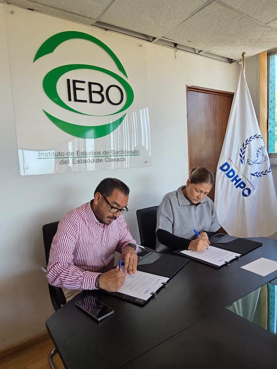 Oaxaca de Juárez, Oax. 20 de enero de 2026.- El Instituto de Estudios de Bachillerato del Estado de Oaxaca (IEBO) y la Defensoría de los Derechos Humanos del Pueblo de Oaxaca (DDHPO) firmaron un convenio de colaboración para fortalecer la promoción, difusión y defensa de las garantías individuales en el ámbito educativo.