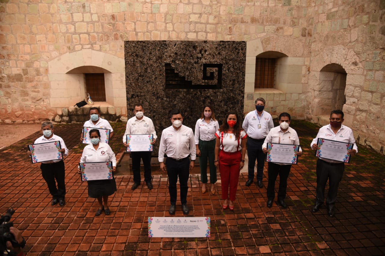Oaxaca de Juárez, Oax. 25 de septiembre de 2020. La Secretaría de Turismo del Gobierno del Estado de Oaxaca (Sectur Oaxaca) y autoridades municipales de los Pueblos Mágicos de la entidad, llevaron a cabo la firma de la Carta de Hermanamiento de los cinco Pueblos Mágicos del Estado de Oaxaca, con la finalidad de fortalecer la estrategia de desarrollo del turismo en dichas poblaciones.