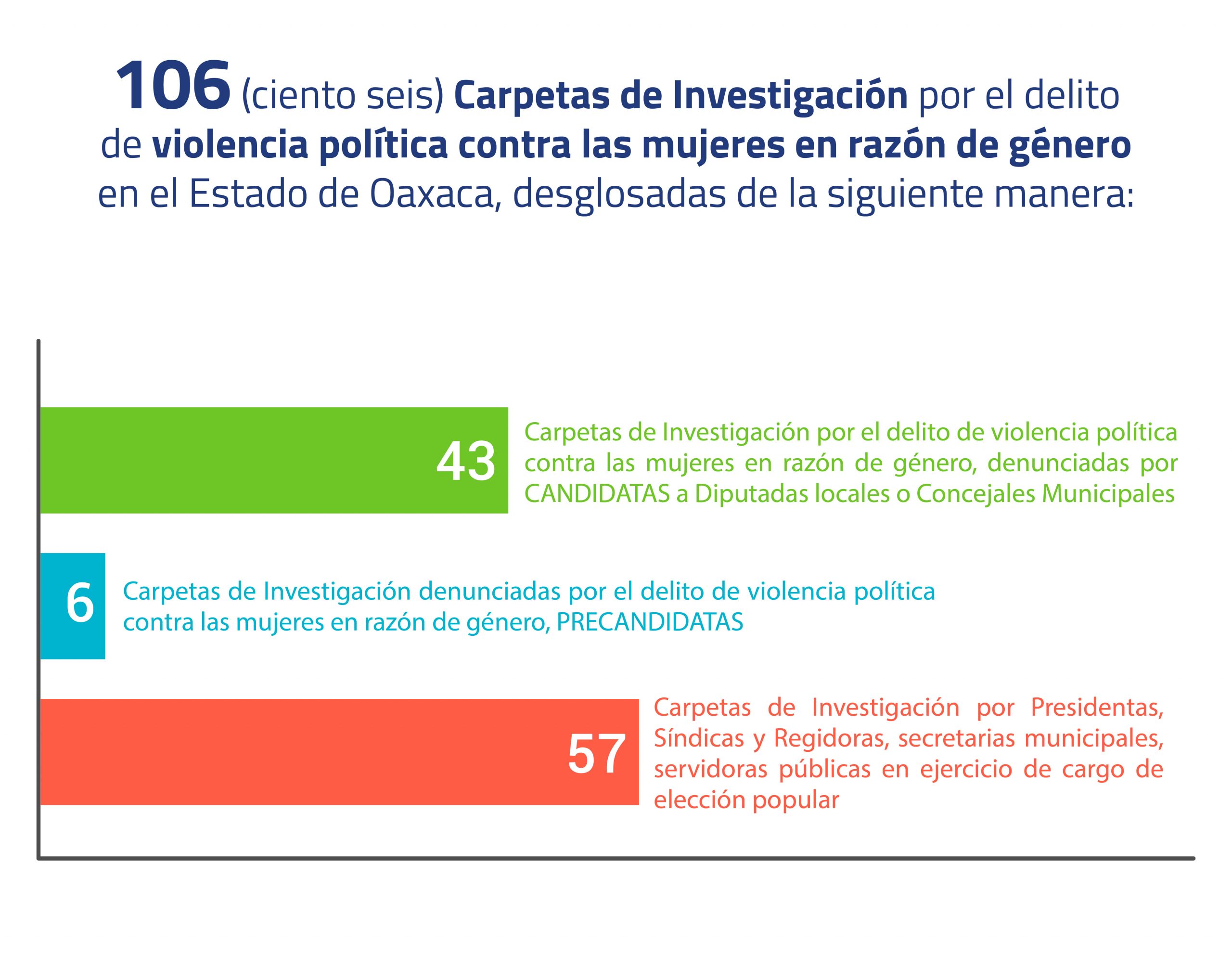 Al respecto, el Fiscal General, Arturo Peimbert, informó que en el proceso electoral, la Institución de procuración de justicia, a través de la Fiscalía Especializada en Delitos Electorales, integró 106 carpetas de investigación por el delito de violencia política contra las mujeres en razón de género en el estado.