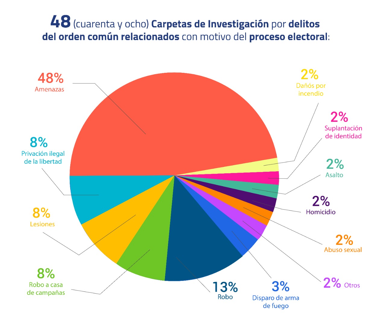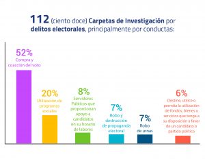 A su vez, se integraron 112 carpetas de investigación por delitos electorales, principalmente por conductas irregulares como compra y coacción del voto, utilización de programas sociales, robo y destrucción de propaganda electoral, robo de urnas, entre otros, así como 48 carpetas por delitos del orden común relacionados con motivo del proceso electoral.