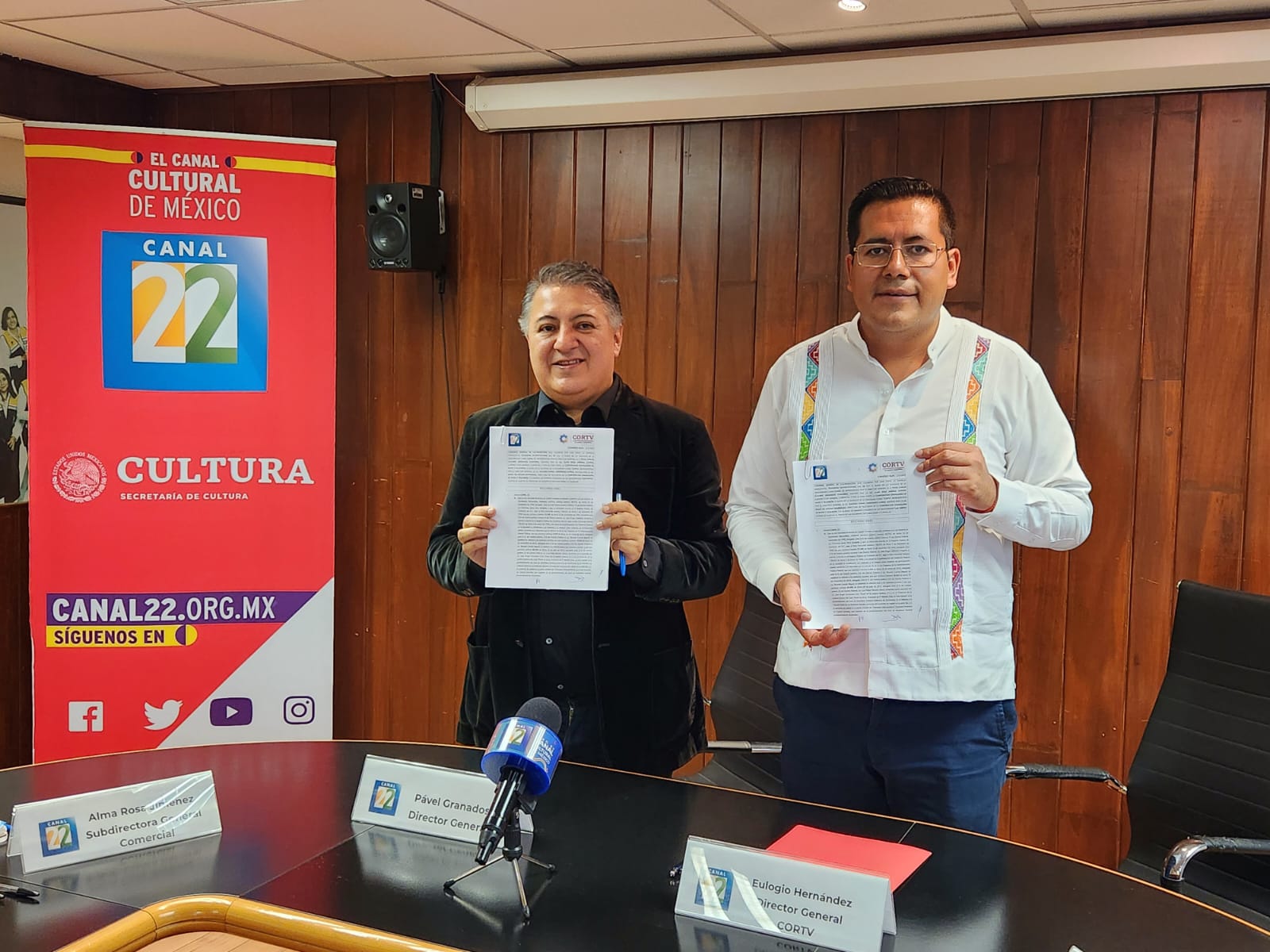 Finalmente, ambos directivos se congratularon de signar el convenio que favorece a las audiencias. También, firmaron como testigos la directora de Televisión de la CORTV, Diana Isis Molina Domínguez y la Subdirectora General Comercial de Canal 22, Alma Rosa Jiménez Chávez.
