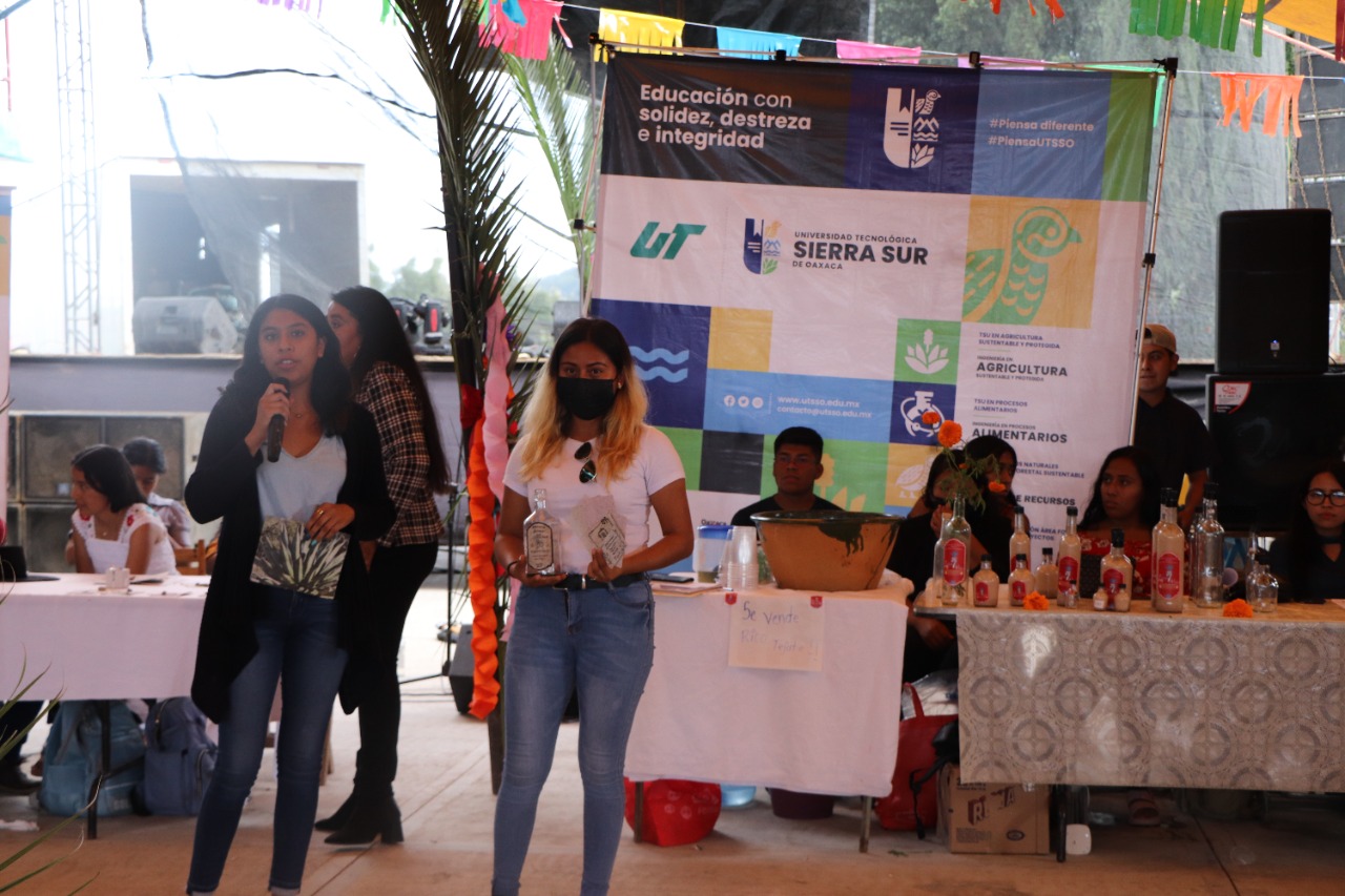 Villa Sola de Vega, Oaxaca, 17 de octubre de 2022. Jóvenes de la Universidad Tecnológica de la Sierra Sur de Oaxaca (UTSSO), participaron en la segunda edición de la feria del mezcal, realizada en la Sección Cuarta de Villa Sola de Vega para fortalecer vínculos de comercialización y colaboración con productores de mezcal de la región de la Sierra Sur, informó la rectora de esta casa de estudios, Jazmín Jeanneth Sumano Celaya.