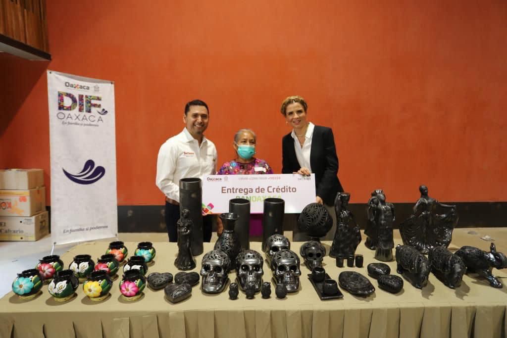 “Me siento muy contenta de ser partícipe en la entrega de estos créditos que benefician a nuestras familias oaxaqueñas, las cuales, necesitan un impulso para continuar trabajando en su emprendimiento. Hoy, estamos aquí apoyando a Luis Alberto y familia, quienes elaboran piñatas a costos muy accesibles, de distintos personajes y para todos los gustos; así como a doña Silvia, artesana de barro negro, quién ocupará este apoyo para comprar anaqueles y así darle mayor exhibición a sus artesanías”, señaló la esposa del gobernador.
