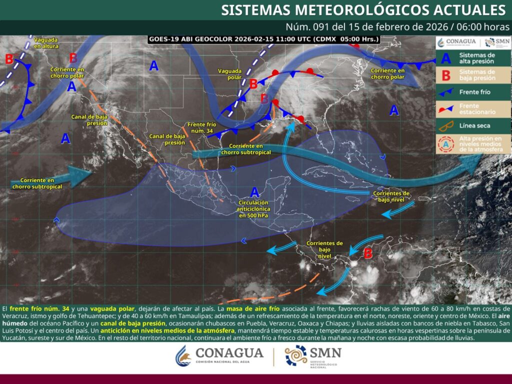 Estas condiciones se derivan del desplazamiento del frente frío número 34, asociado a una masa de aire frío que no logrará ingresar con intensidad al sureste de México, por un bloqueo ejercido por un sistema anticiclónico.