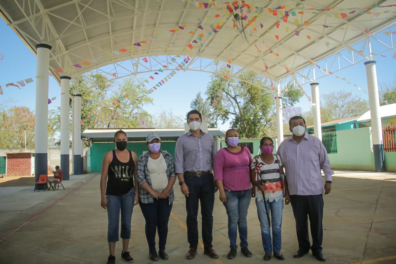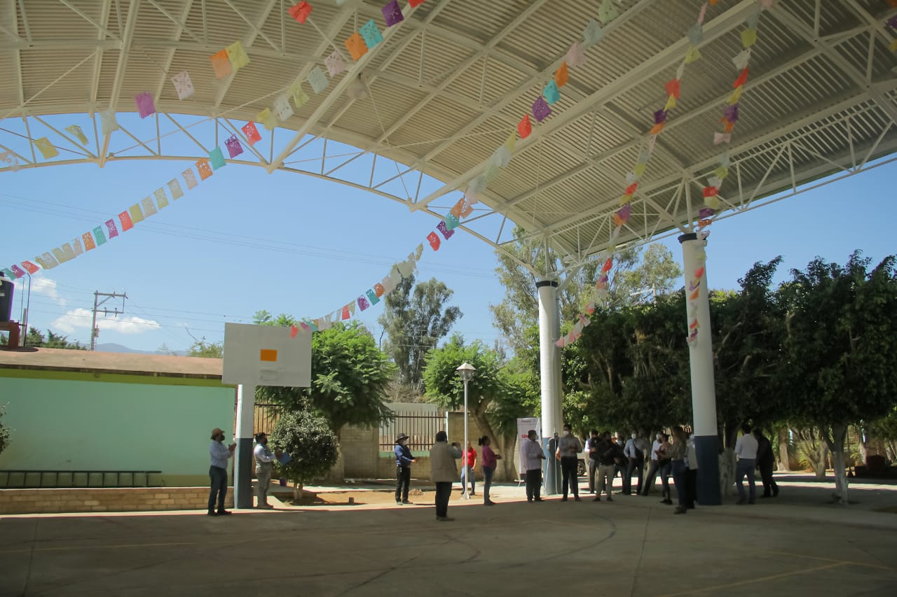 Lazcano Vargas y Barroso Sánchez visitaron también el techado recién terminado en techado, en el área de impartición de Educación Física de la Escuela Primaria Rural «Morelos» de La Raya, Zimatlán.