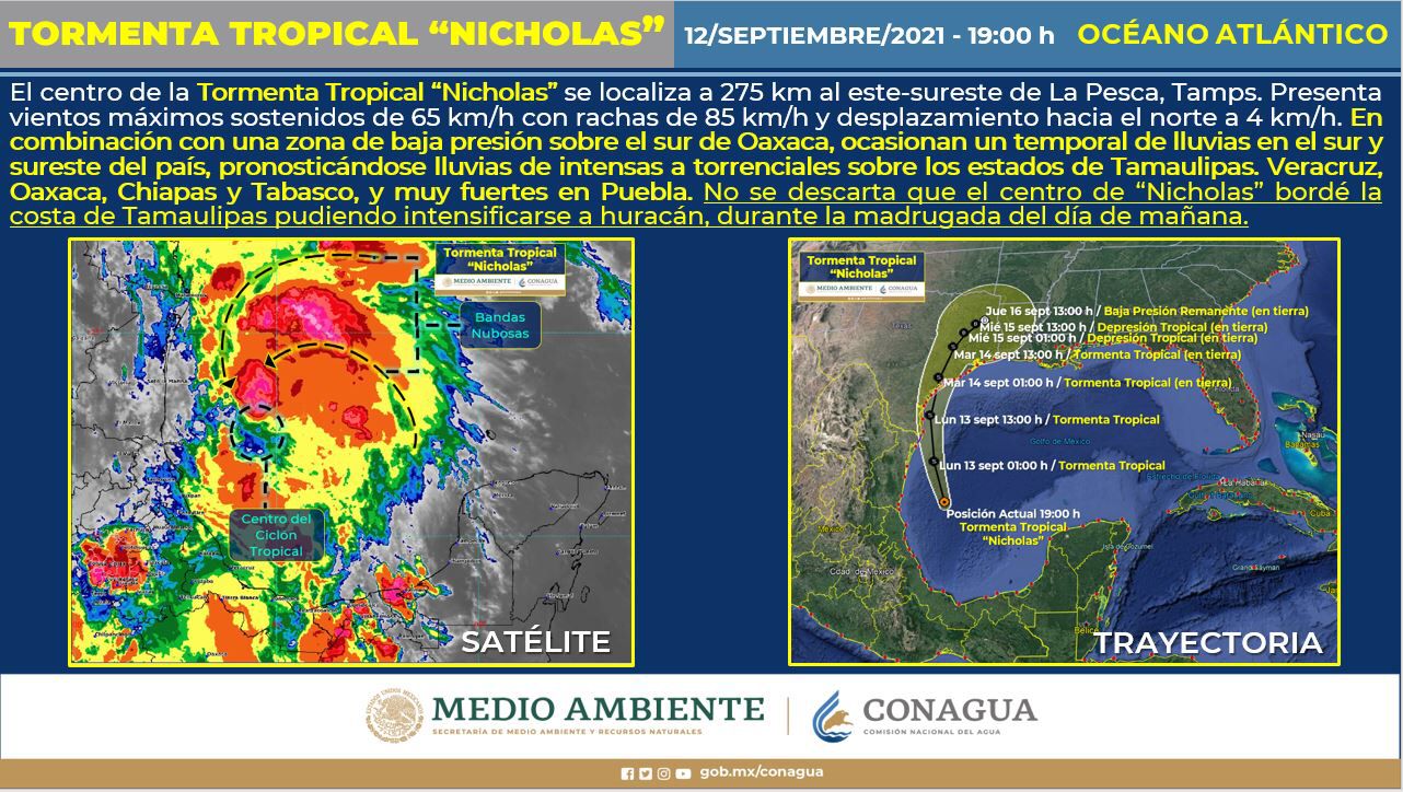 Por su parte, con la Comisión Nacional del Agua (Conagua), informó que la tormenta tropical “Nicholas” se localiza a 275 km al este-sureste de La pesca, Tamaulipas; presenta vientos máximos sostenidos de 65 kilómetros por hora (km/h) con rachas de 85 km/h y desplazamiento hacia el norte a 4 km/h en combinación con una zona de baja presión sobre el sur de Oaxaca ocasionando un temporal de lluvias al sur y sureste del país, pronosticándose lluvias de intensas a torrenciales. Asimismo, no descarta que “Nicholas” pueda intensificarse en huracán durante la madrugada de este lunes.